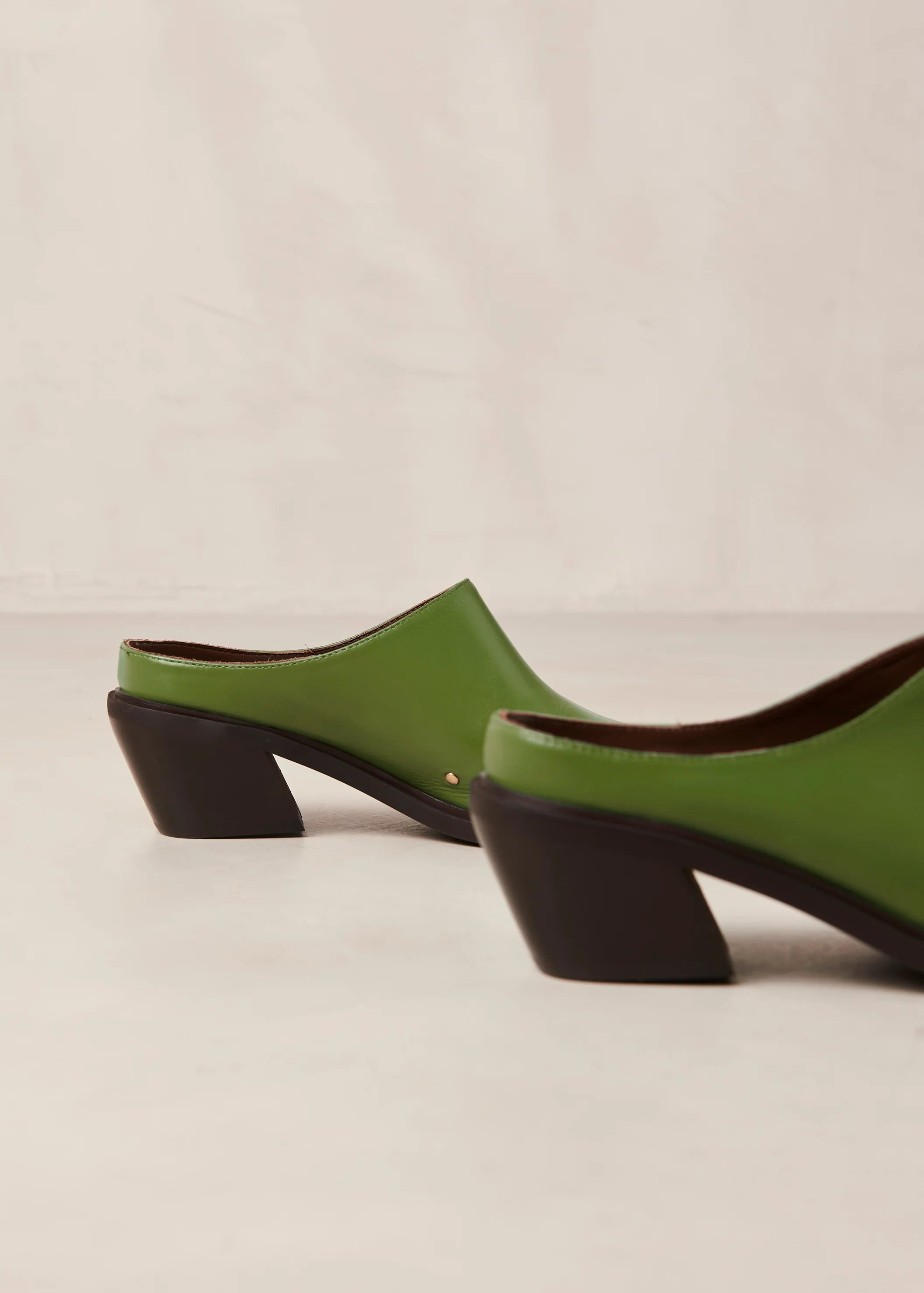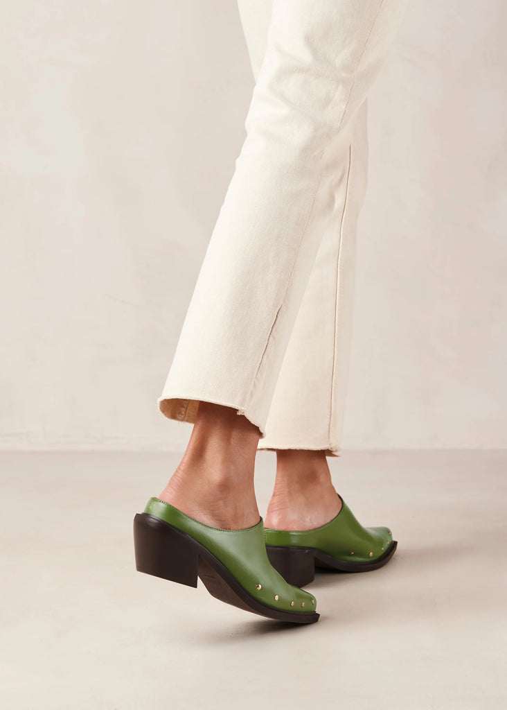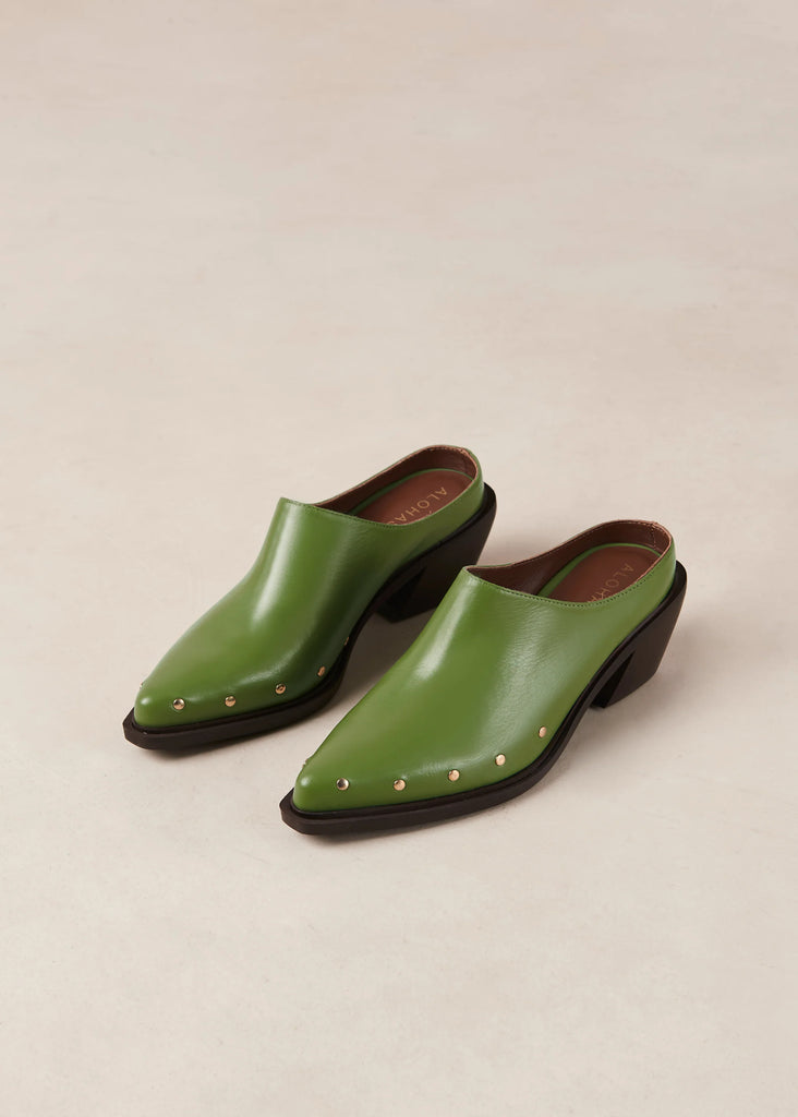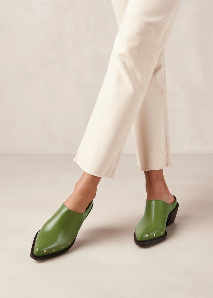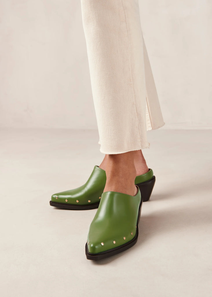 Green leather pointed-toe mules with Cuban heel by Alohas.