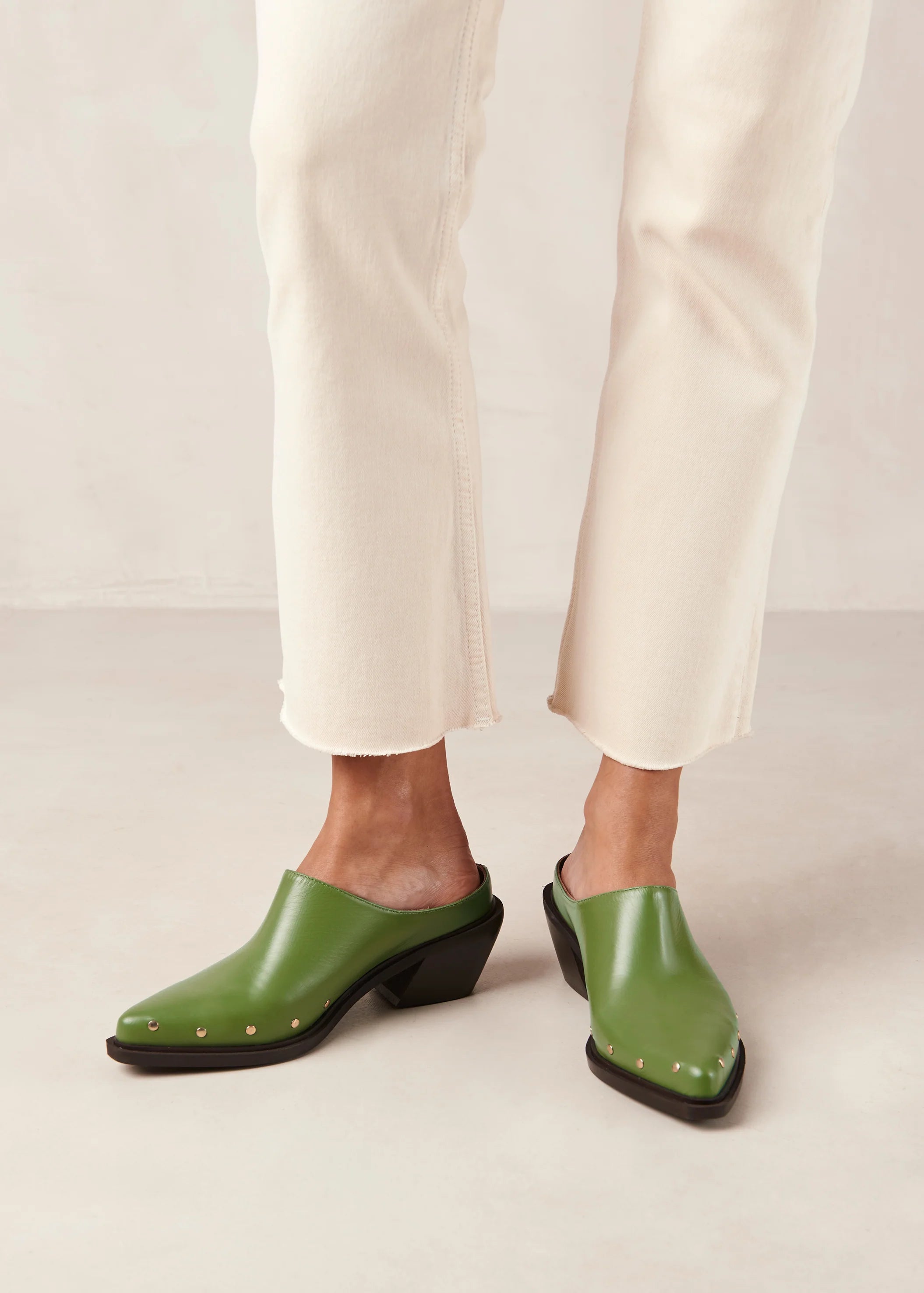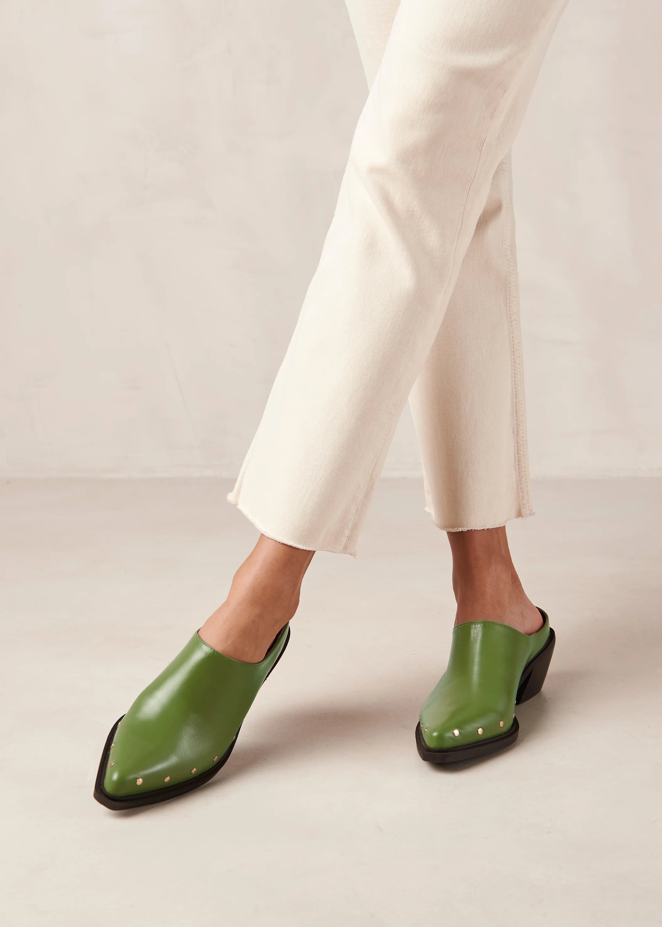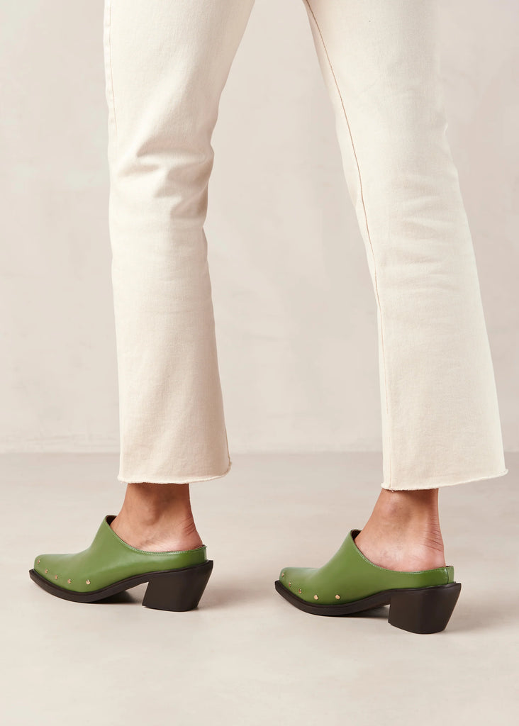 Green leather pointed-toe mules with Cuban heel by Alohas.