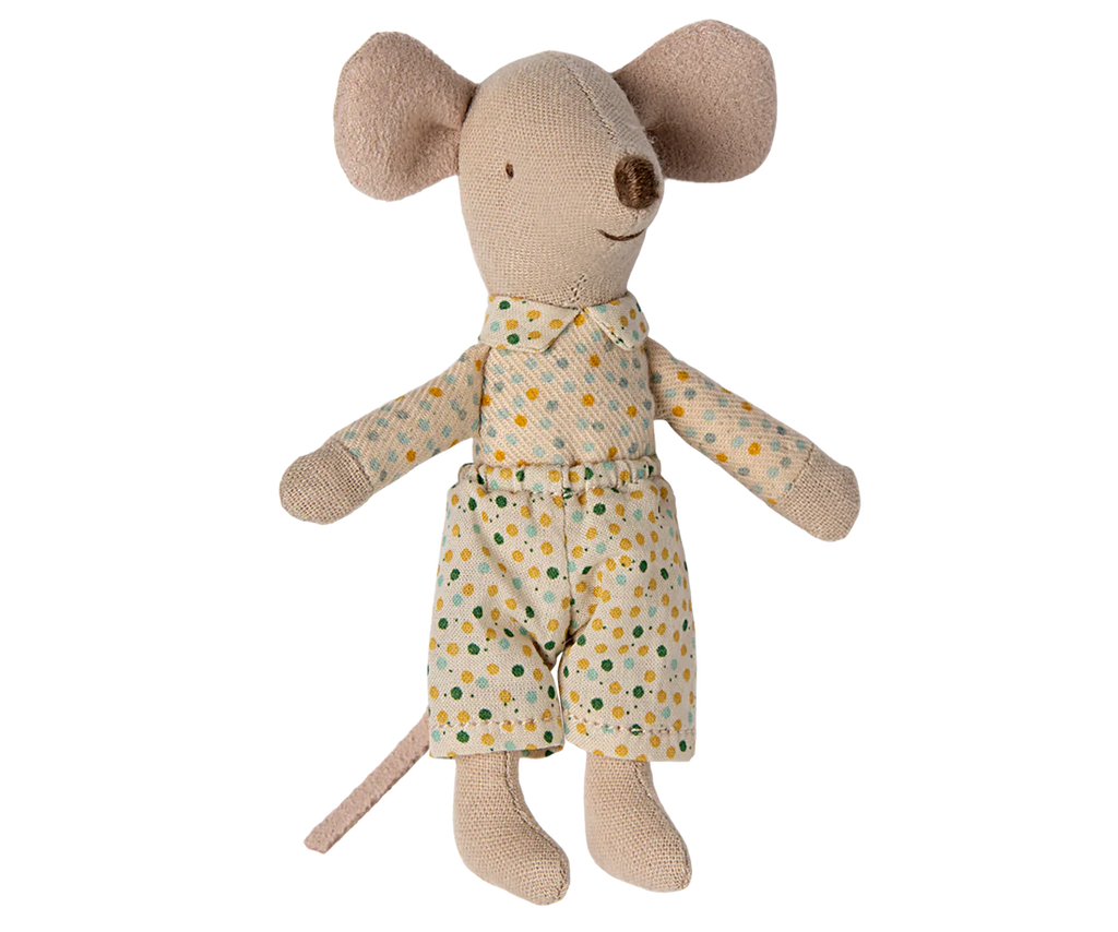 A classic Maileg item. This mouse is ready for hours of play and sleeps tight in the little matchbox. The clothes and bedlinen are made of soft fabrics with unique prints in beautiful colours. Extend the story by adding accessories to the play.