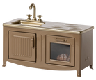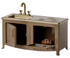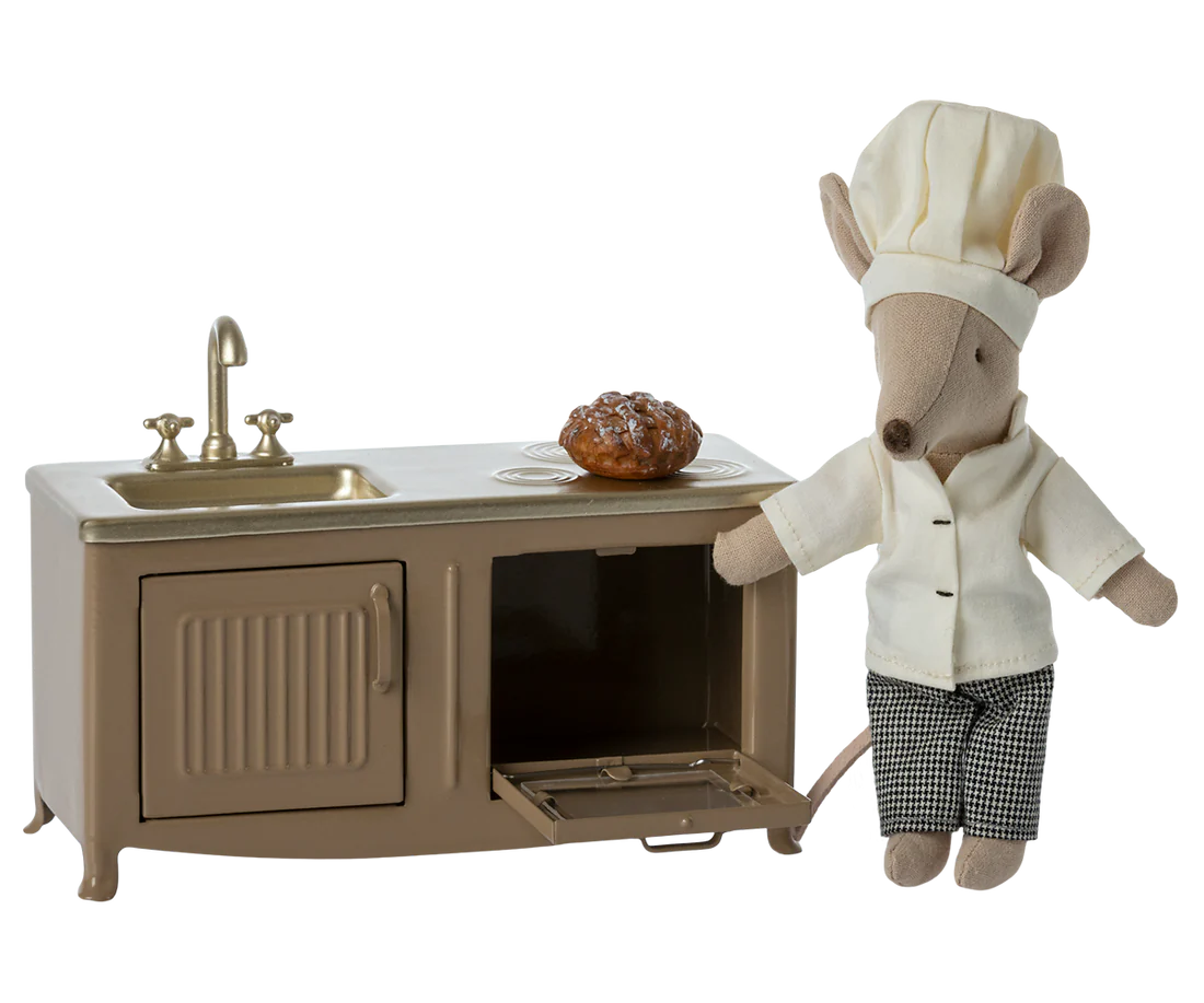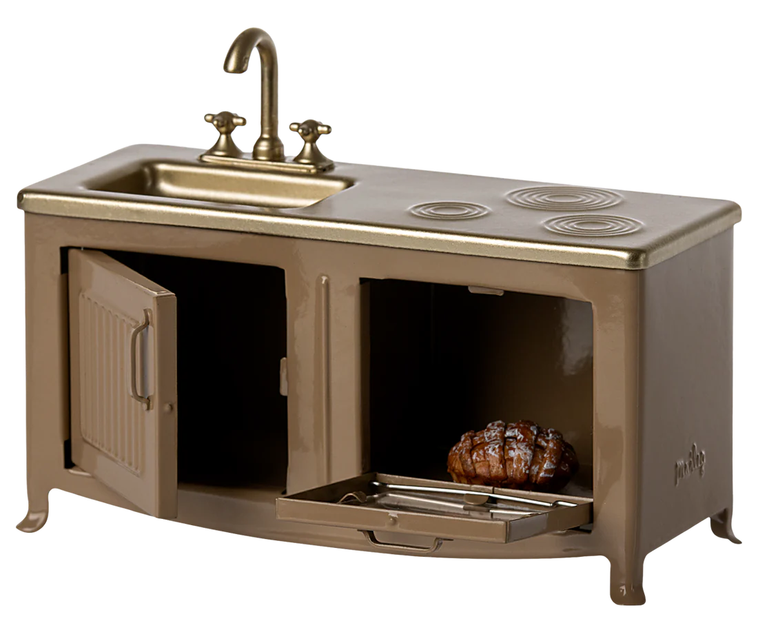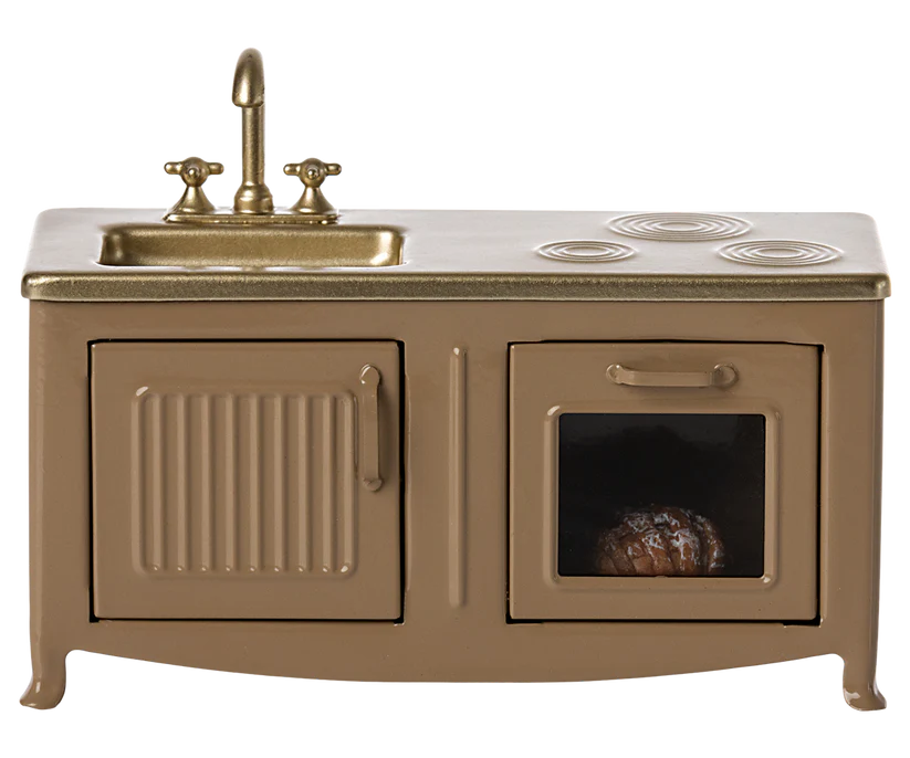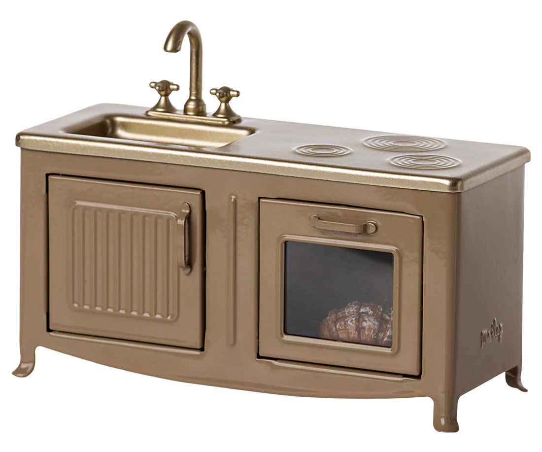 The heart of every home is the kitchen. This metal kitchen has a beautiful colour tone and has many playful details such as cabinet door, sink and an oven with a freshly baked pie. It is perfect in size for the mouse family.