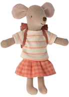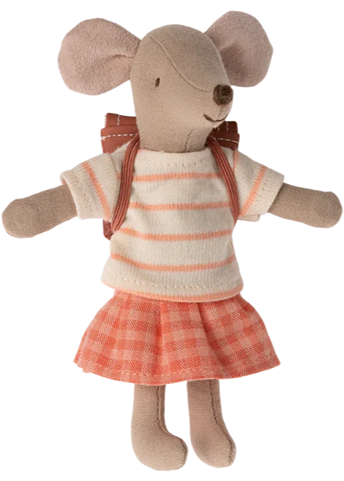 Big sister mouse is ready for a day in school, carrying her backpack on the back. She has magnets in her hands so she can hold the handles of the tricycle for a fast trip.