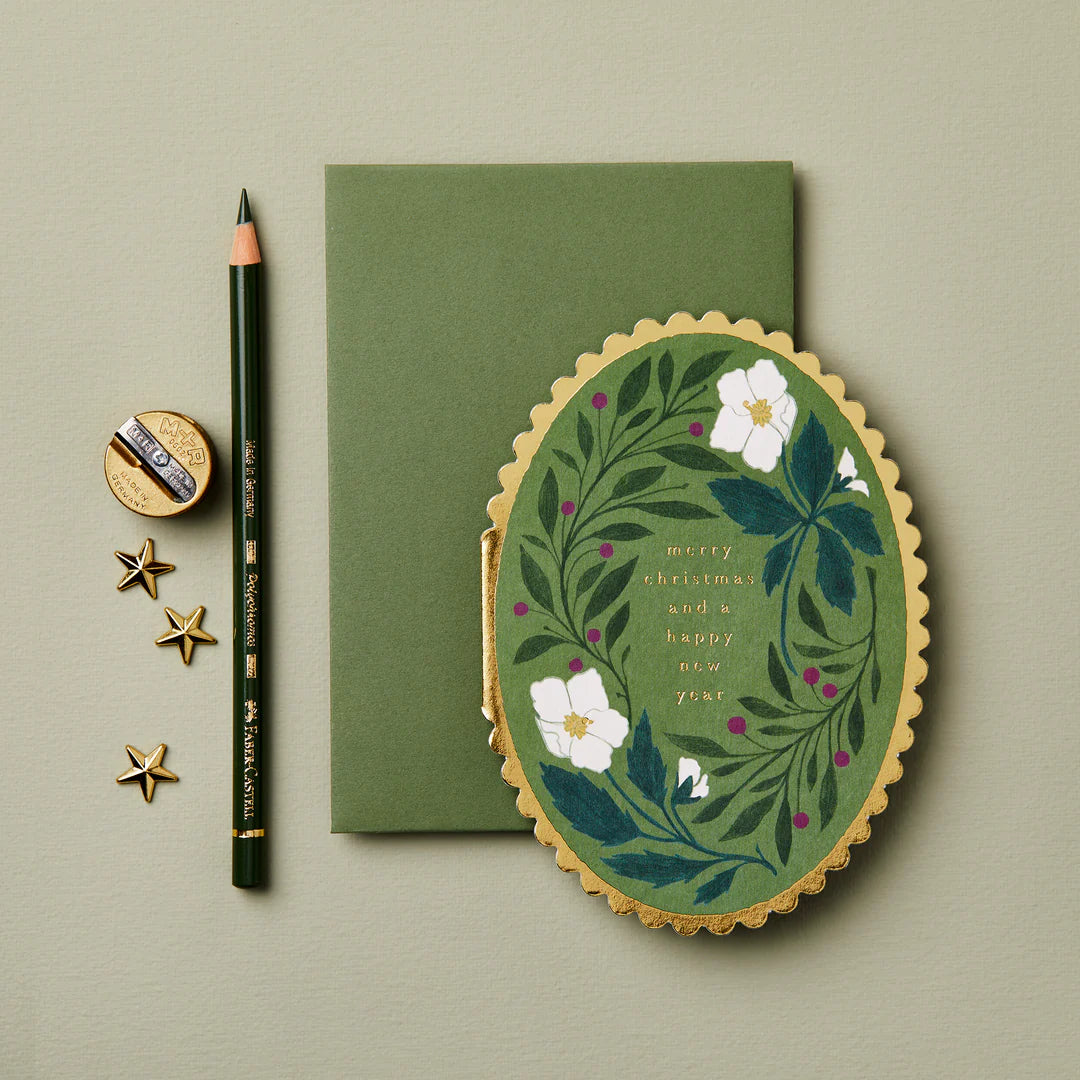 A beautiful oval card with golden scallop edging. A floral wreath design adorns this card, featuring festive berries and a white hellebore. The gold foil text in the centre of the card reads 'Merry Christmas and a Happy New Year'. Paired with a complementary forest green envelope.