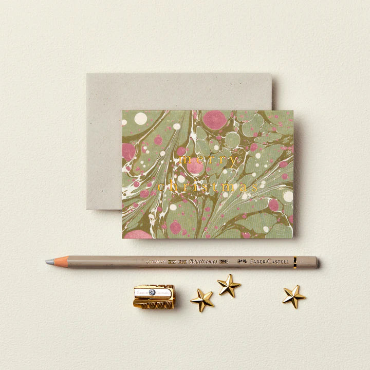 A little card with an all over green marble print and 'merry christmas' in gold foil. Each card is paired with a pale grey C7 envelope.