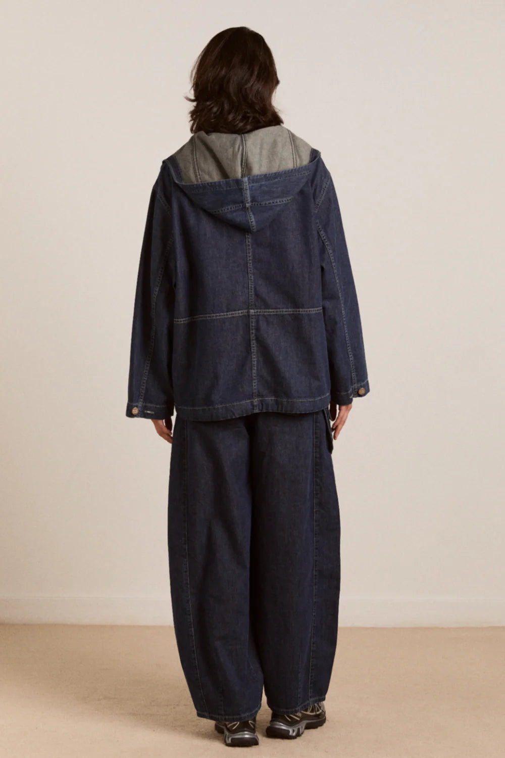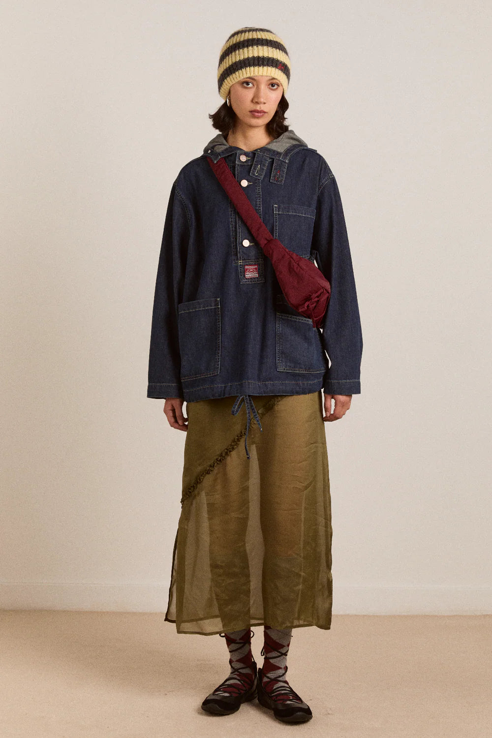 Effortlessly laid back with elevated detailing, this oversized smock-style hoodie is crafted from soft, fluid denim made from 100% organic cotton. Designed with a relaxed silhouette, it features a front shank fastening, contrast stitching, and adjustable cuffs for a custom feel. Functional touches include a front pocket, drawstring hem, and a signature DM branded patch. Made in Turkiye. Select your regular size for the perfect oversized fit.