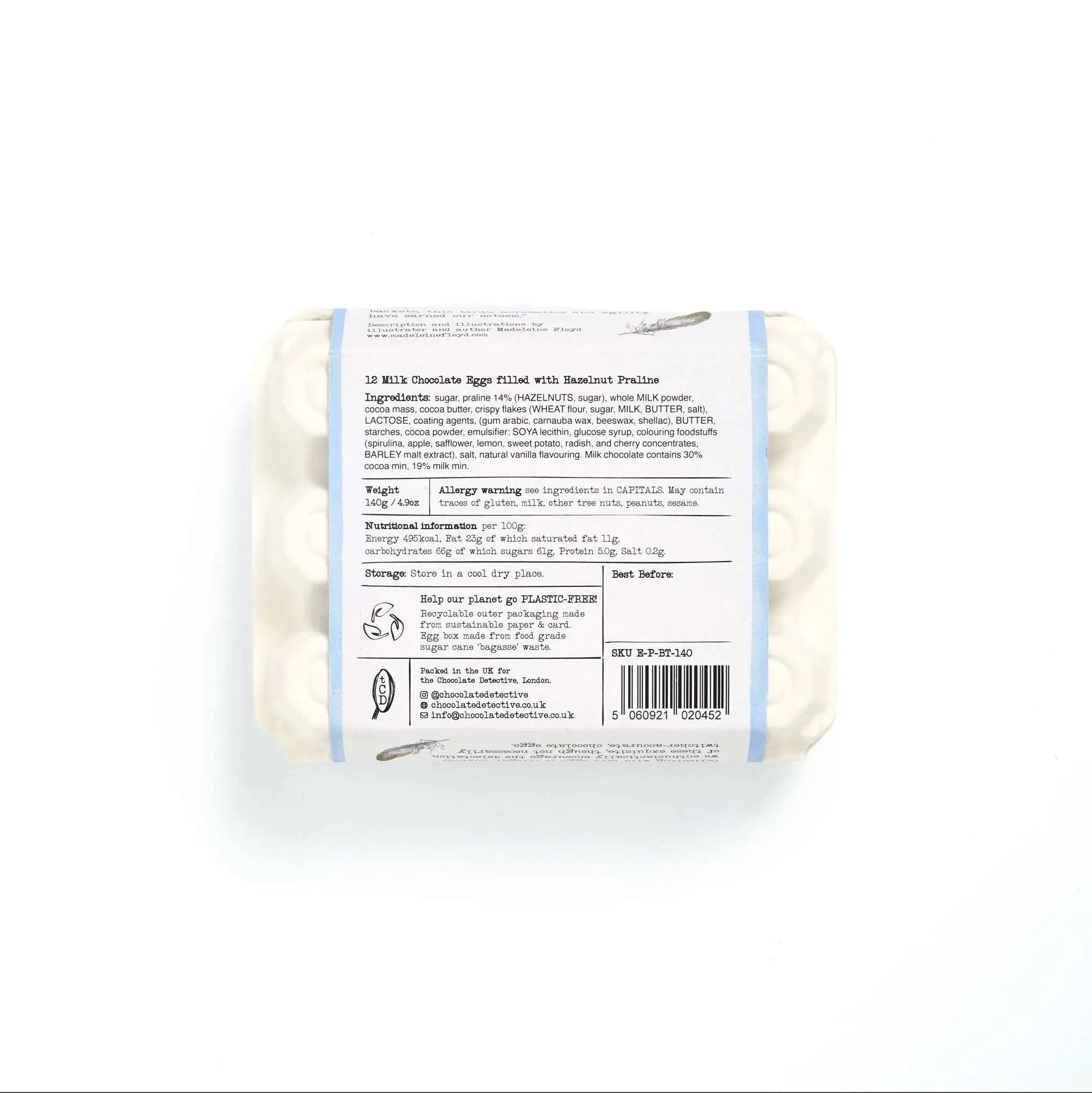 12 Chocolate Eggs filled with a fine hazelnut praline or salted caramel.