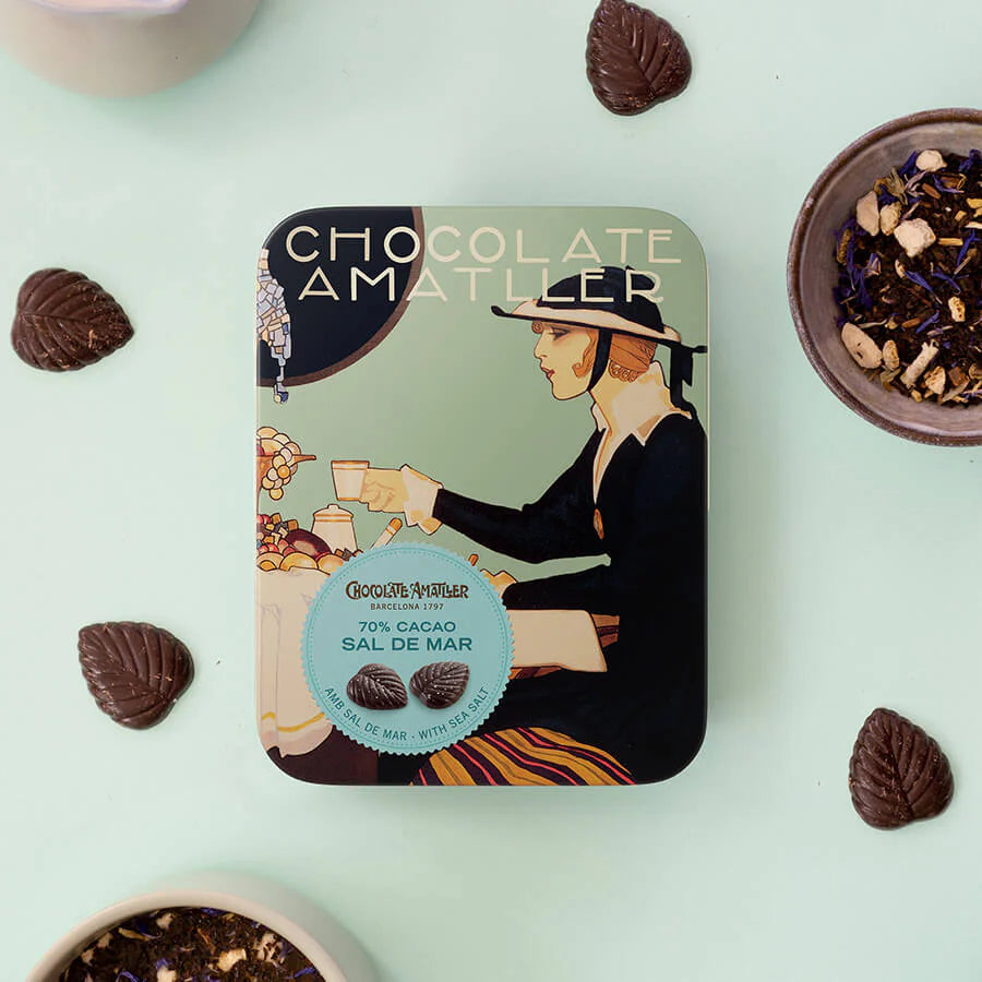 Delicious thin leaves of 70% cocoa chocolate with a touch of Mediterranean salt. They come in a lovely tin decorated with a vintage illustration from the early 1900s. Perfect for gifting and stocking fillers.