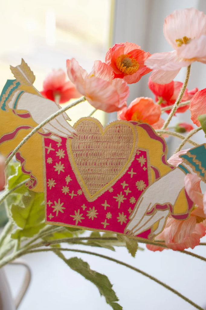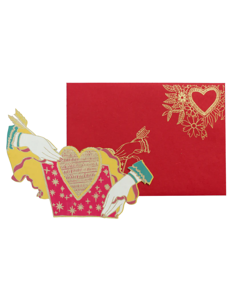 This greeting card has metallic gold details and is die cut into the shape of a heart. Complete with a text panel on the reverse for the sender's message, and with an illustrated envelope.