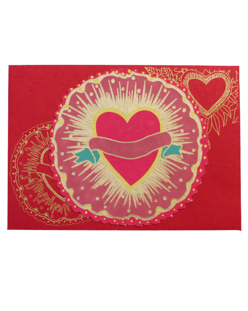This double sided, die cut heart is embellished with metallic gold flourishes. There is a panel on the reverse for your message, and a matching envelope.