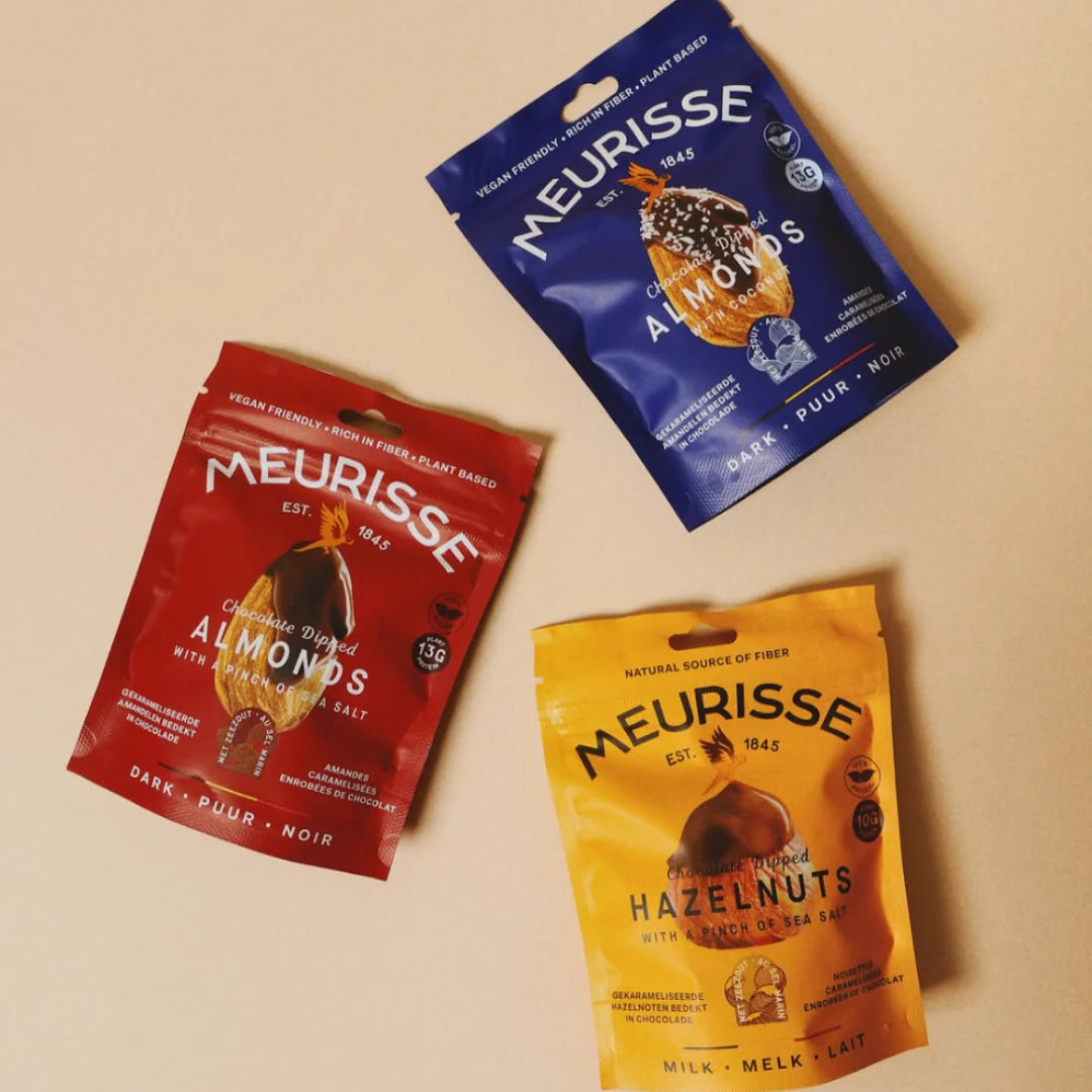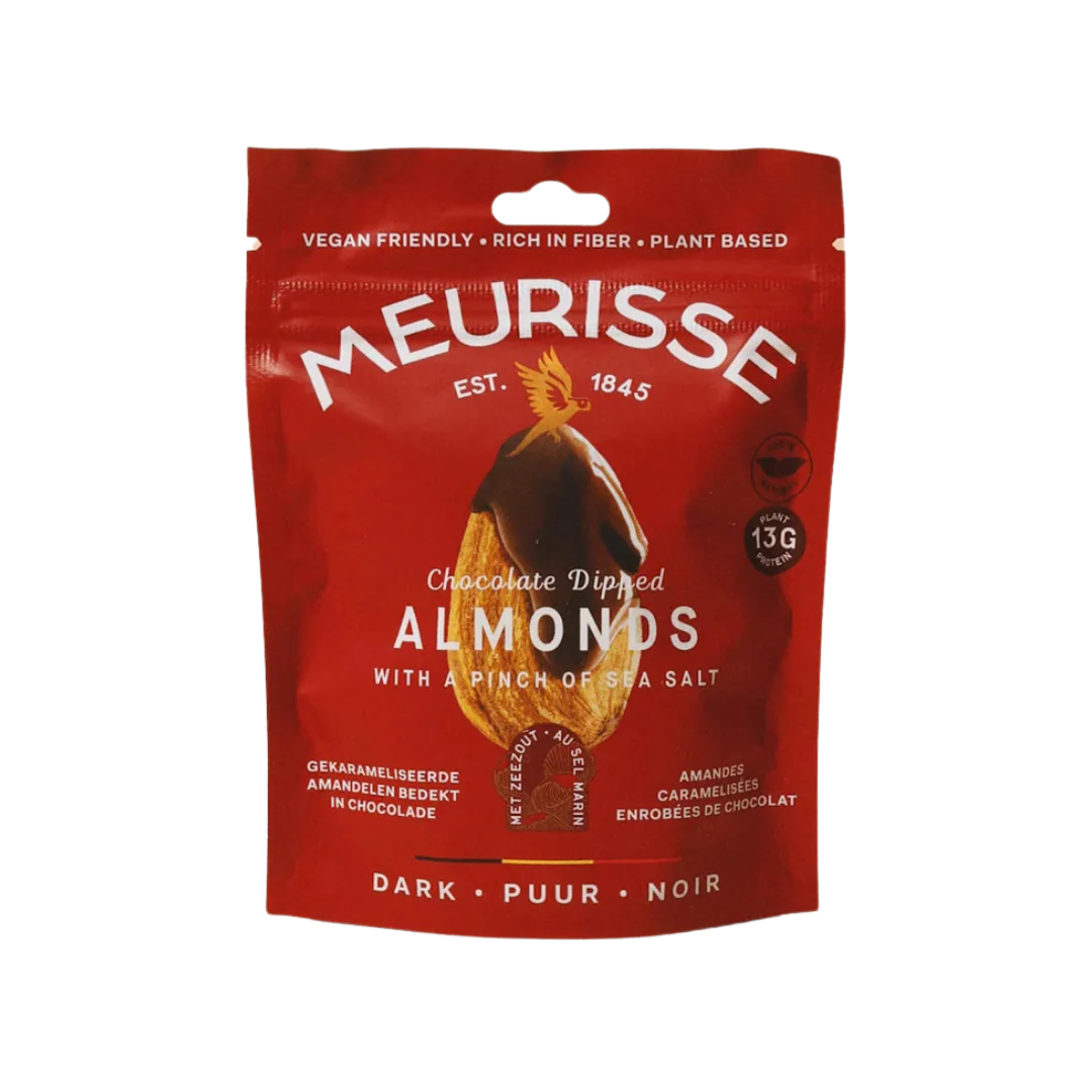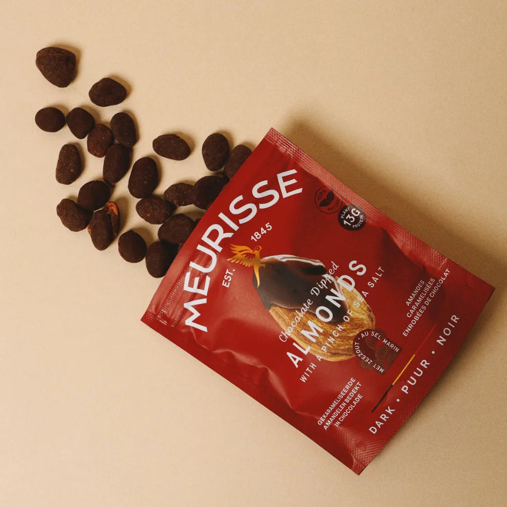 - Crunchy caramelized almonds dipped in a thin layer of dark chocolate with a pinch of salt.