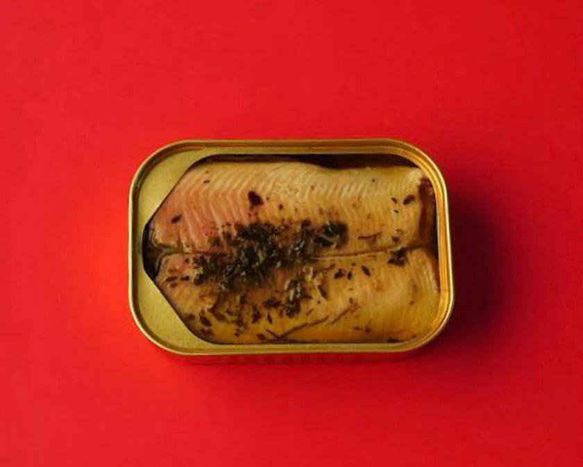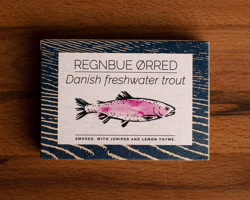 Smoked freshwater trout with juniper and lemon thyme. This is a recipe steeped in Nordic culinary (and family) tradition. Martin Bregnballe, the co-founder of Fangst, developed the recipe, inspired both by many childhood visits to trout farms with his biologist father and the spices that his mother used to cook with. Juniper is a classic Scandinavian accompaniment in smoked dishes, and the lemon thyme means the tin is fragrant, aromatic and has depth of flavour.