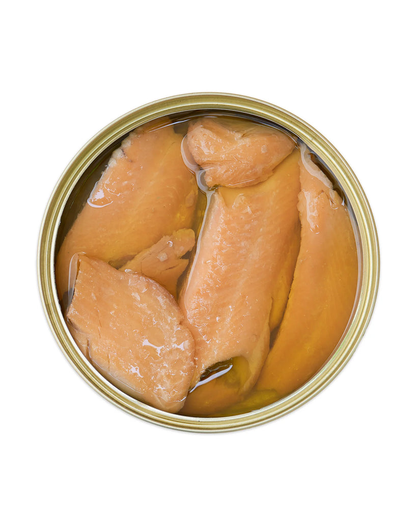 Sea Sisters award winning rainbow trout is gently smoked over oak and preserved in a quality, extra virgin olive oil. This superb fish is delicious with eggs for breakfast or with crackers, cream cheese & pickles.