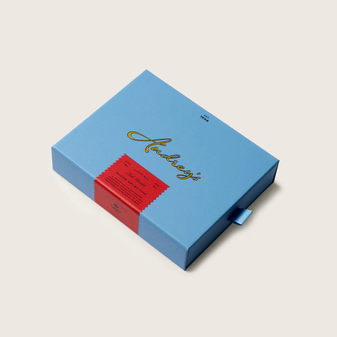 An elegant collection of Audrey’s finest dark chocolate creations. This Queen-sized box offers a rich assortment of handcrafted chocolates – from vibrant fondant creams and bold caramels to dark praline, ginger, and nutty pralines – all enrobed in smooth, intense Valrhona 62% dark chocolate. A refined choice for lovers of deep, balanced cocoa and timeless craftsmanship.