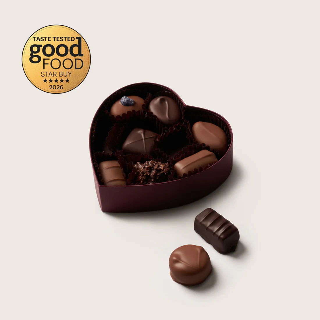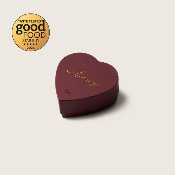 luxurious claret-coloured heart, finished with gold foil and an embossed Audrey’s logo — an unmistakable mark of craftsmanship and care. Inside, discover a curated selection of our favourite milk and dark chocolates, featuring a full range of beloved flavours. Available in four sizes, this timeless gift is beautifully presented and made to be savoured.