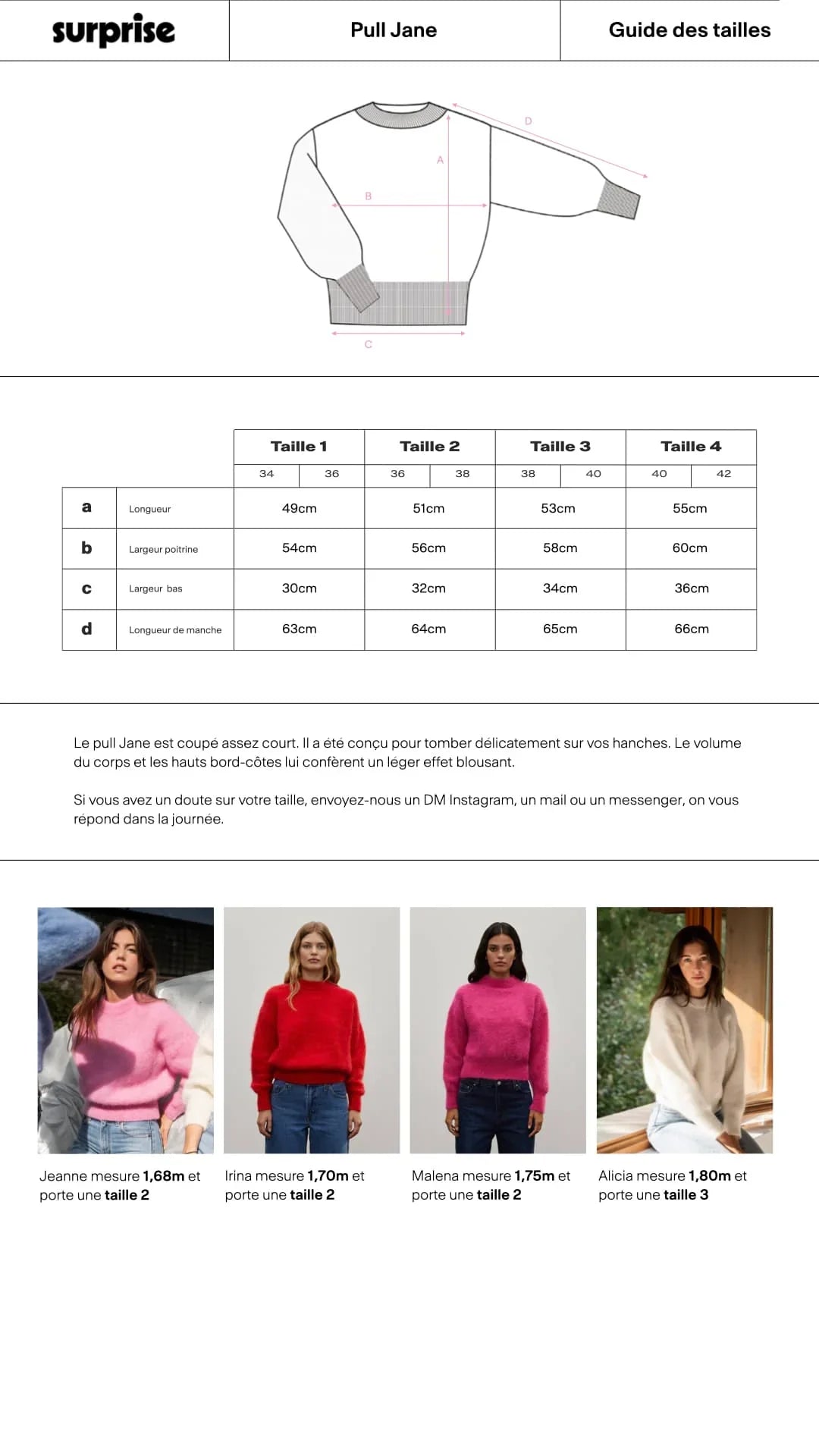 The Jane mohair sweater is cut fairly short. It is designed to fall delicately on your hips. The volume of the body and the high ribbing give it a slight blousant effect.