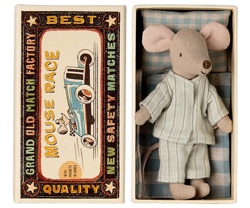 A classic Maileg item. This mouse is ready for hours of play and sleeps tight in the little matchbox. The clothes and bedlinen are made of soft fabrics with unique prints in beautiful colours. Extend the story by adding accessories to the play.