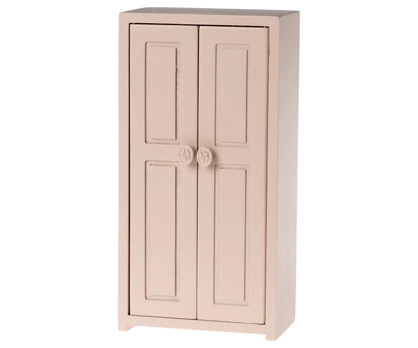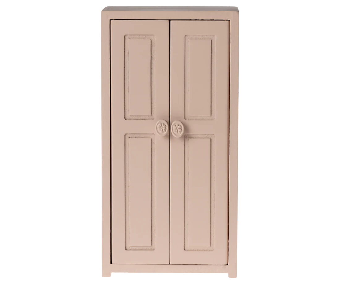 A small closet helps the mice family organize their wardrobe. The closet comes with three golden hangers.