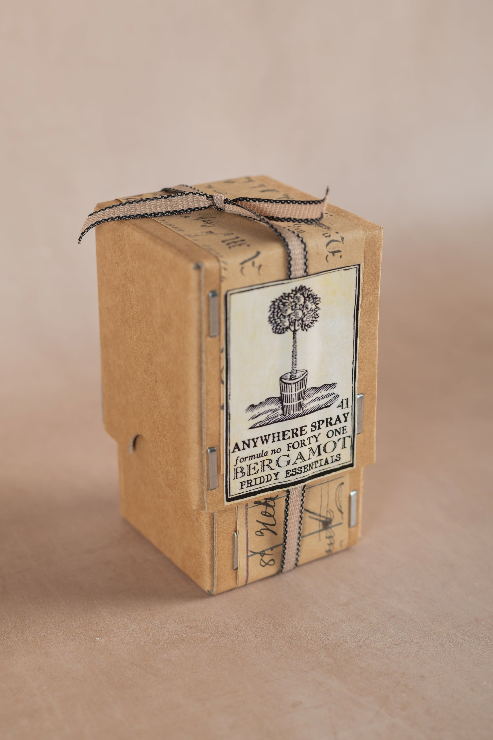 Priddy Essentials scented sprays are created for home or personal use and are safe on the skin. Presented in an amber glass spray bottle inside a kraft card box.