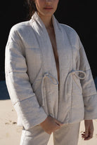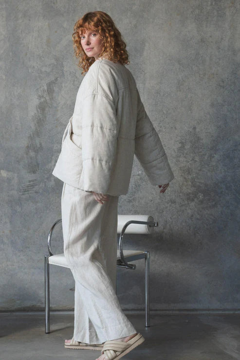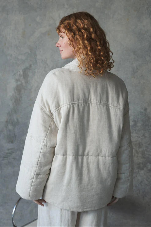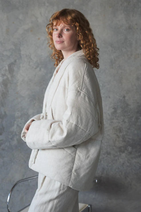 This quirky ASTER OATMEAL LINEN COAT, made from luxurious European linen features an oversized fit with a puffer-style kimono design. It's also outfitted with chunky tubular front ties and spacious front pockets, as well as a convenient left chest inner pocket. To top it off, the coat is expertly crafted with French seams to ensure durability and style.