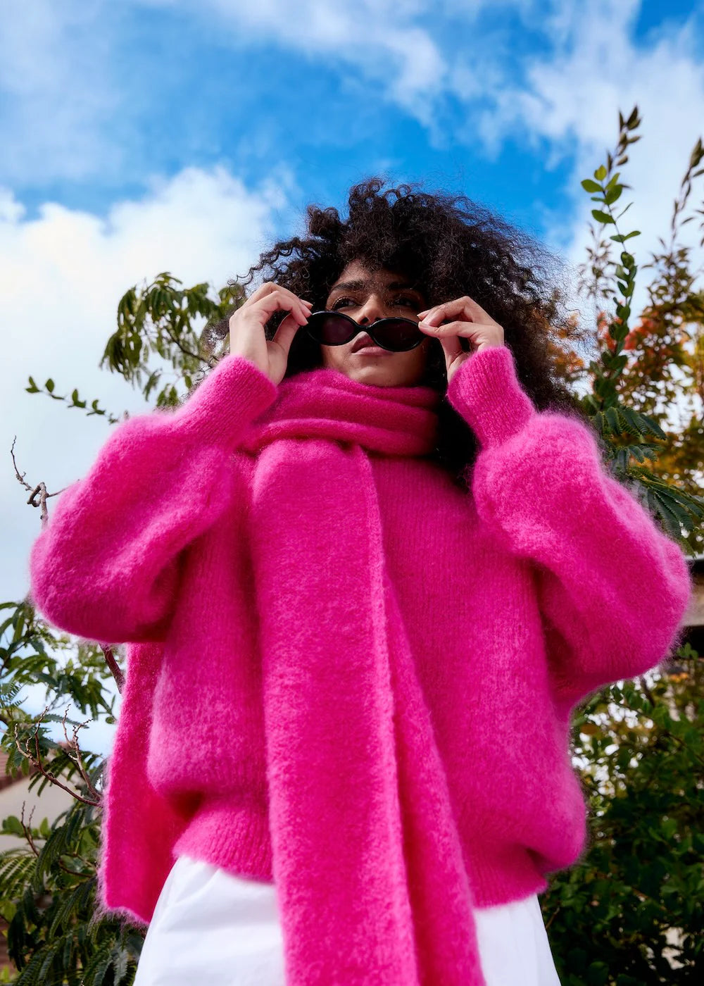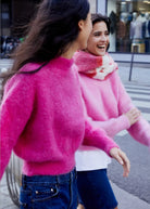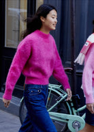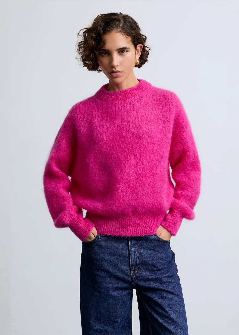 The Jane mohair sweater is cut fairly short. It is designed to fall delicately on your hips. The volume of the body and the high ribbing give it a slight blousant effect.