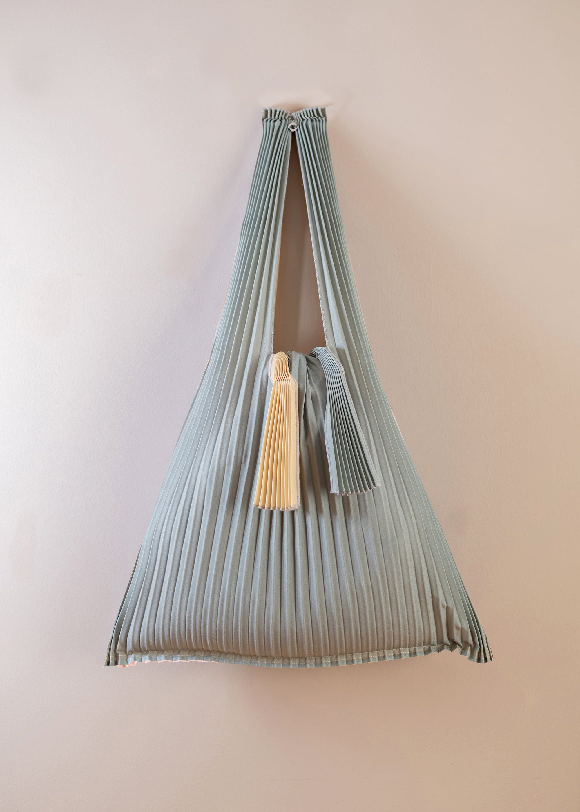 Large sized over the shoulder bag. By extending the pleats, the bag can carry the equivalent of a shopping basket. Roll or tie it up for keeping it compact. It withstands the weight up to 15kg, but it may tear by adding sudden force such as lifting it at a stretch, so please lift slowly when you put in a heavy item.