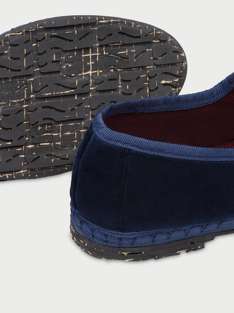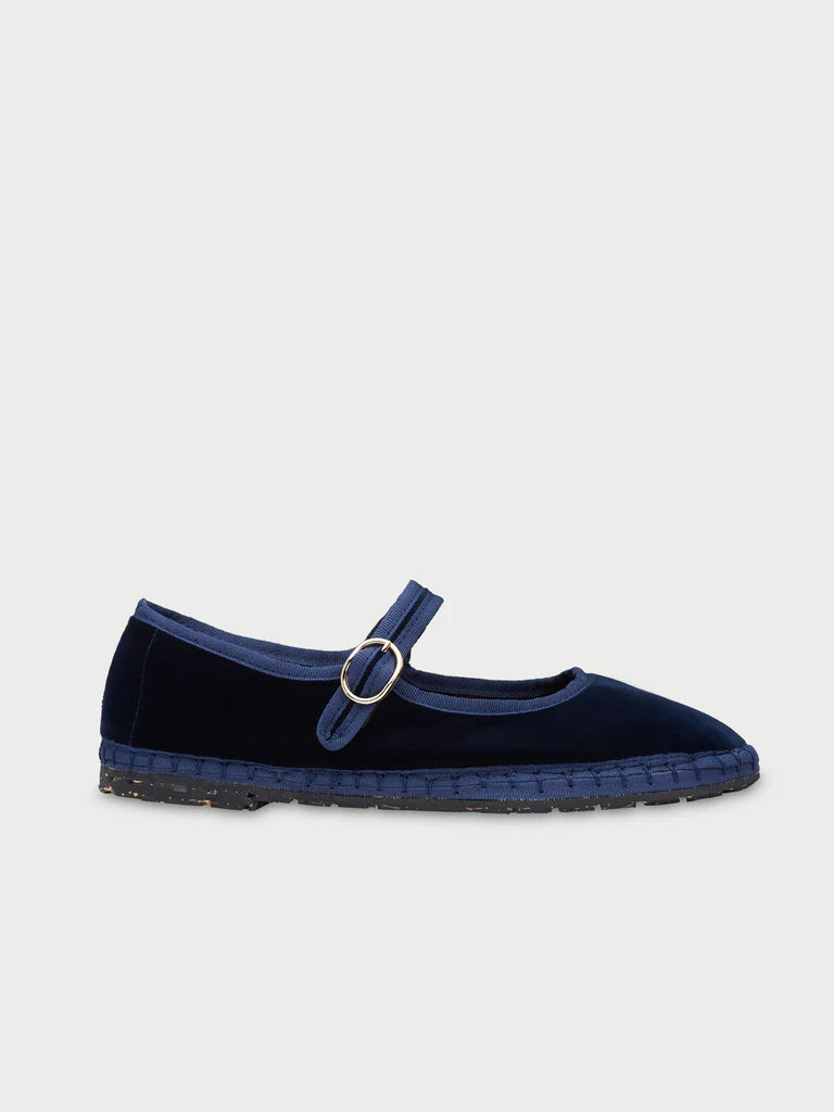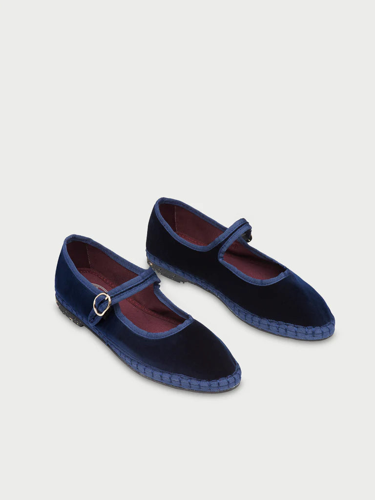 Velvet mary jane in dark blue with dark blue piping and buckle closure.