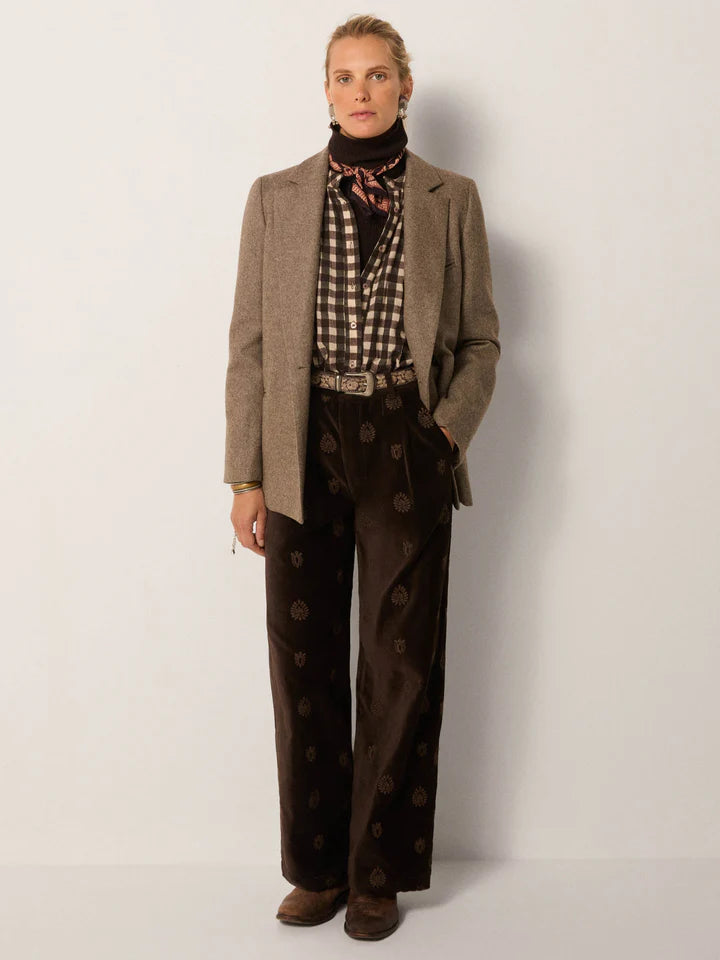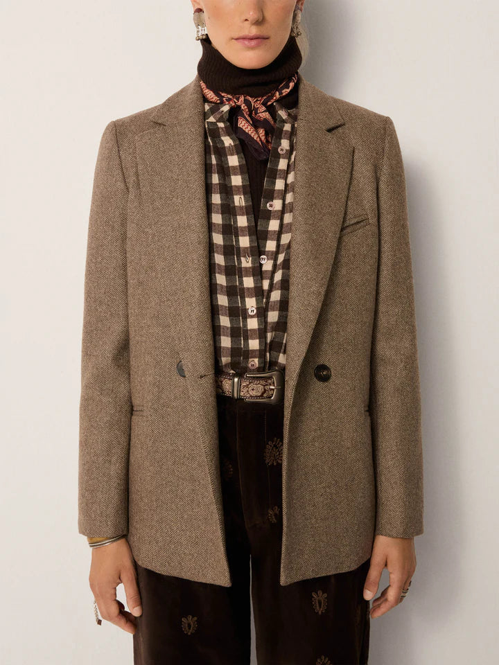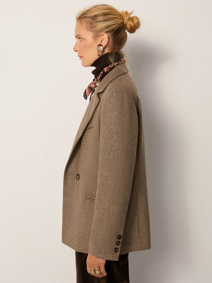 Herringbone wool blend creates depth and texture in a blazer that feels timeless. The earthy walnut tone grounds its structure.
