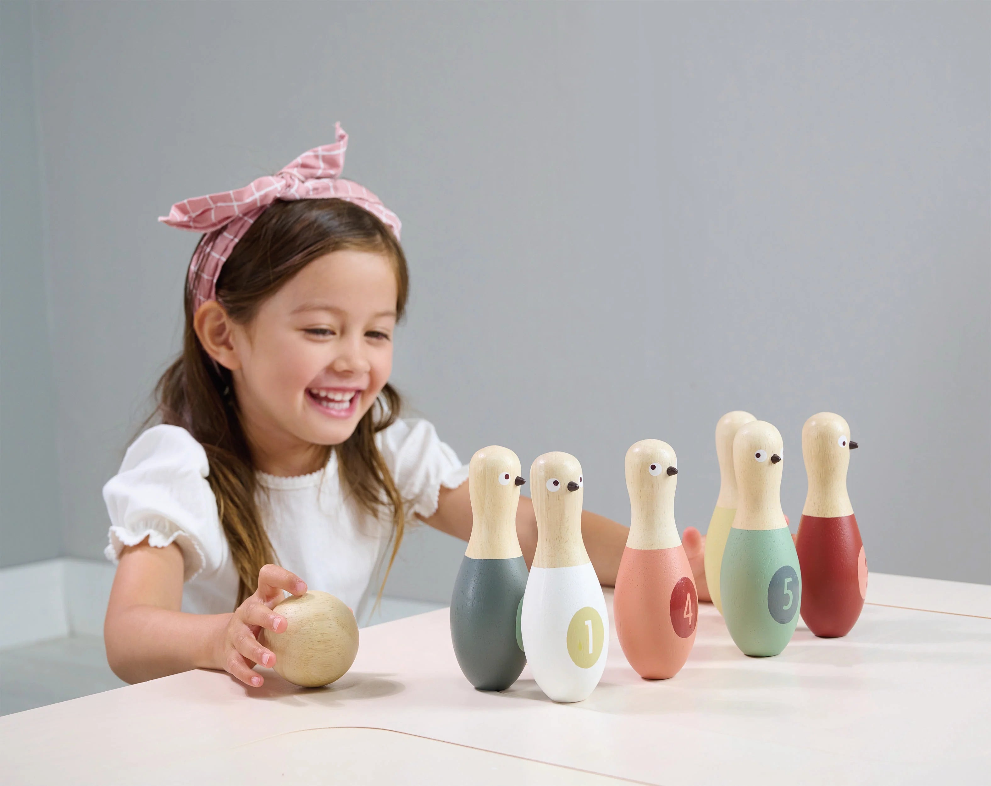 Wooden bowling set comprising 6 skittles inspired by friendly pigeons and a solid wood ball. Different colours and numbers for competitive games. Comes with a fabric drawstring bag.