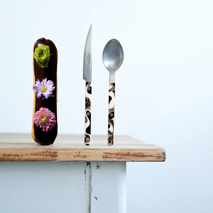 When designing this cutlery they wanted to faithfully capture the atmosphere while adding a modern touch: the styling is simple, the rivets are visible, while the colours and materials stand out nicely. From red to blue, not forgetting the superb materials with horn or tortoise effects. We’re sure you’ll enjoy this collection, which is designed to be both traditional and contemporary at the same time.