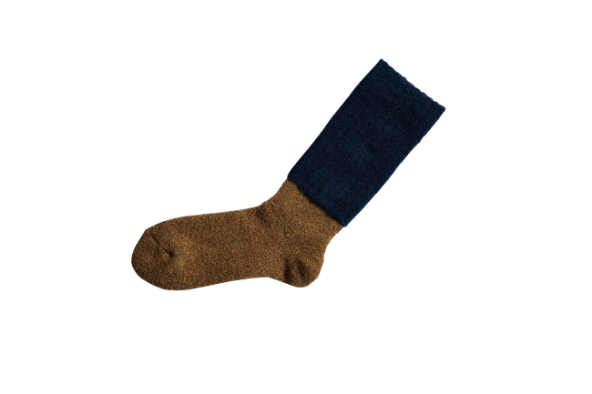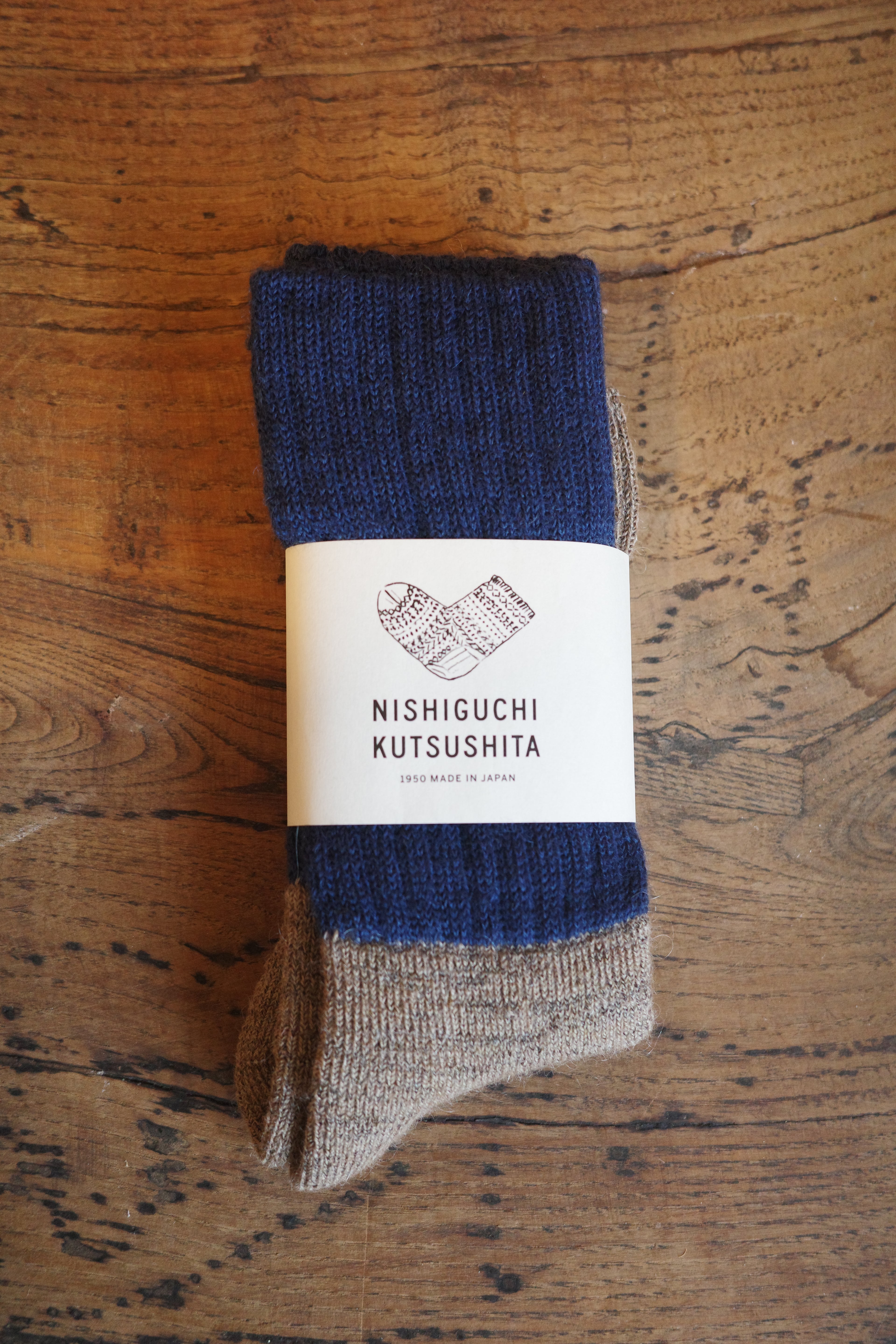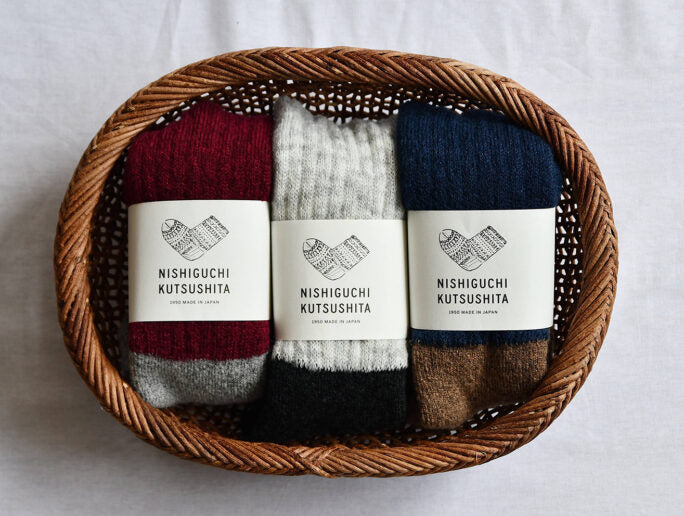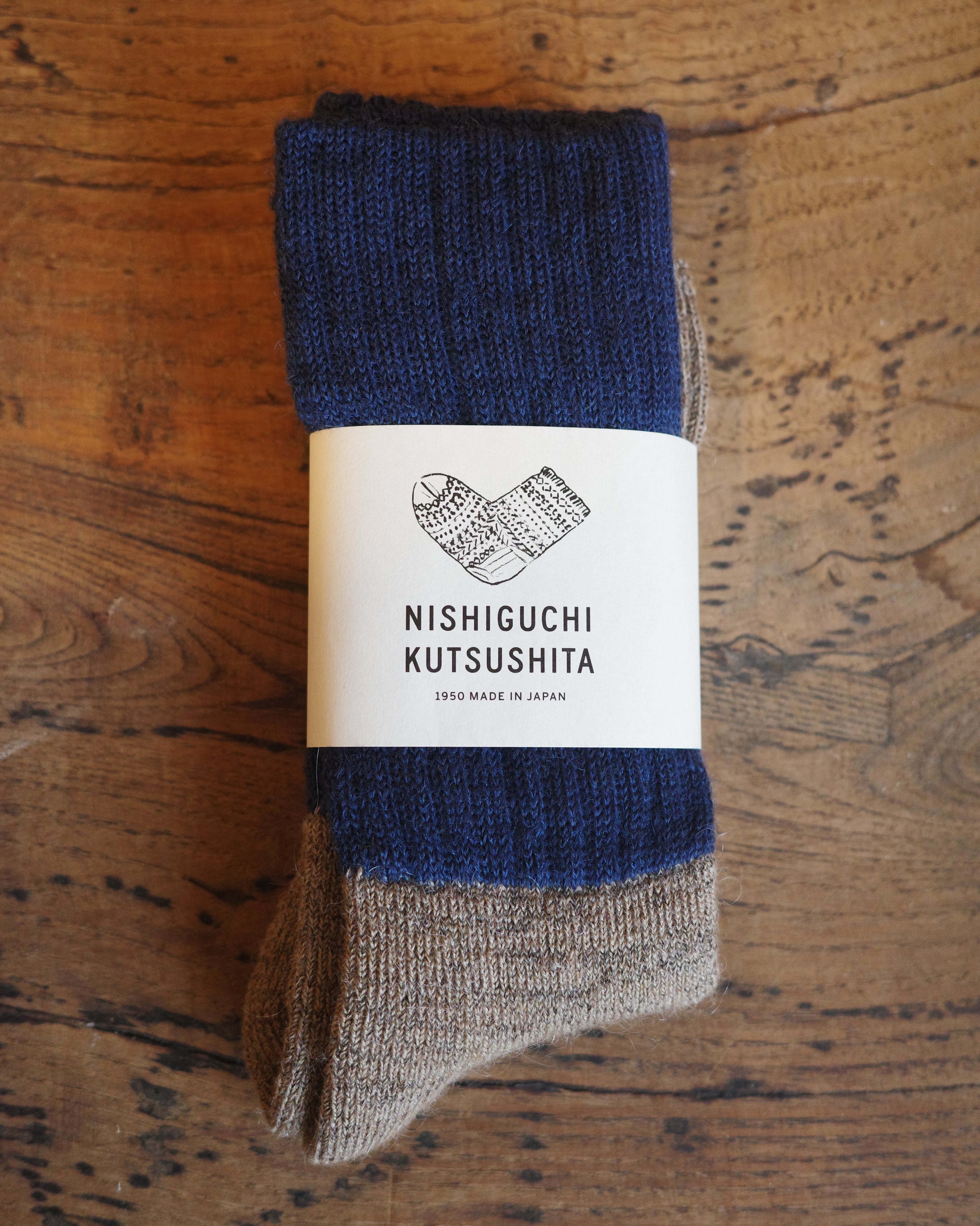 Mohair wool-pile socks We use thread spun with a fine blend of kid mohair and wool. These socks are soft and light yet will not disappoint when it comes to keeping your feet warm. NISHIGUCHI KUTSUSHITA thought of customers in snowy countries when designing this unique combination of sock and legwarmer; pile weave envelops the feet, and the ankles are insulated with a double weave, just like leg warmers.