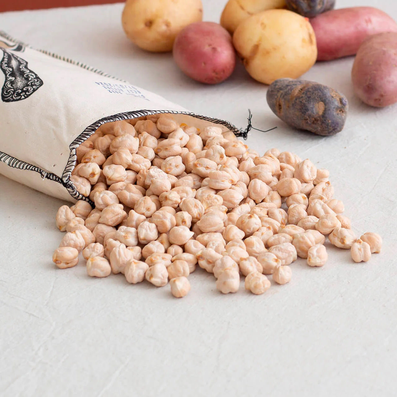 Spanish dry Lechoso chickpeas packed in a cloth sack. These large chickpeas are called lechoso for their creamy texture and slightly milky taste. A versatile and tasty pulse.