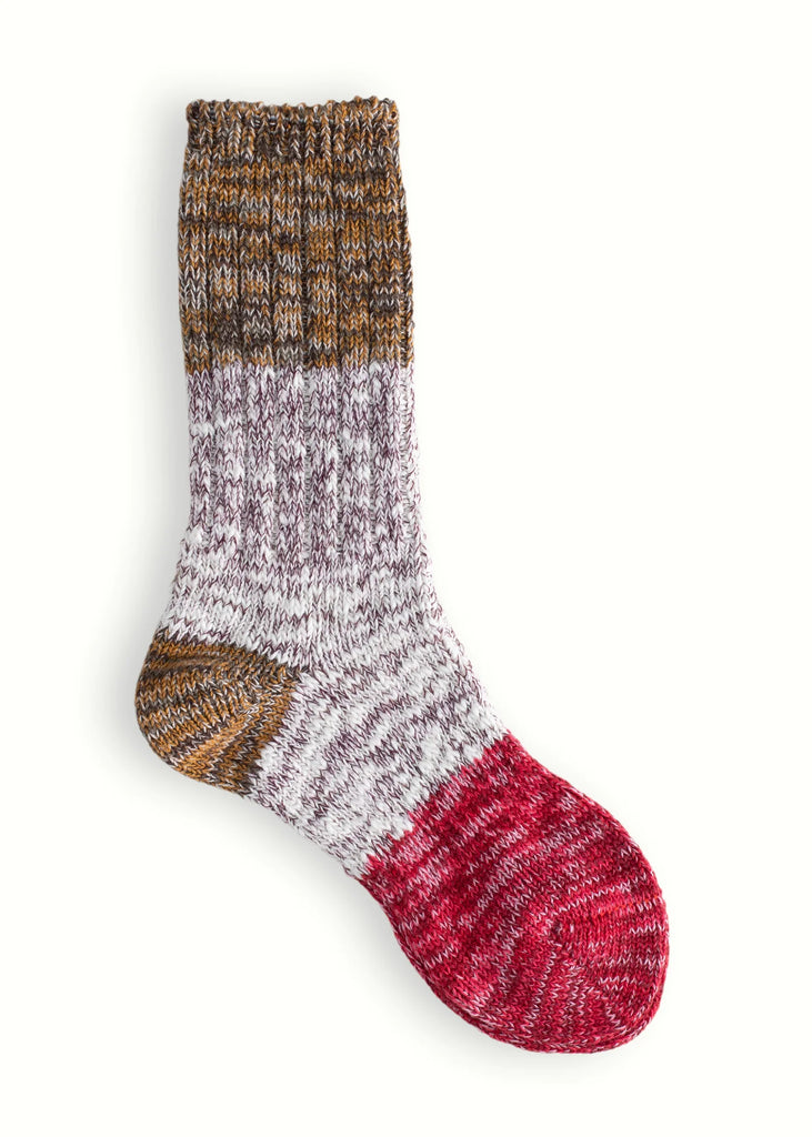 Our Charlie Cotton Red & Coffee Socks are made from a careful selection of high quality 100% Cotton. We produce original and resistant threads from a mixture technique that combine multicolour yarns to create a new colour fusion.