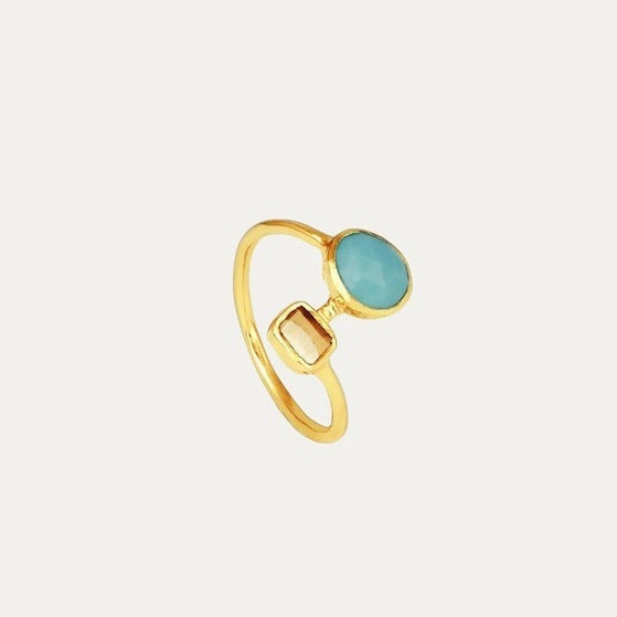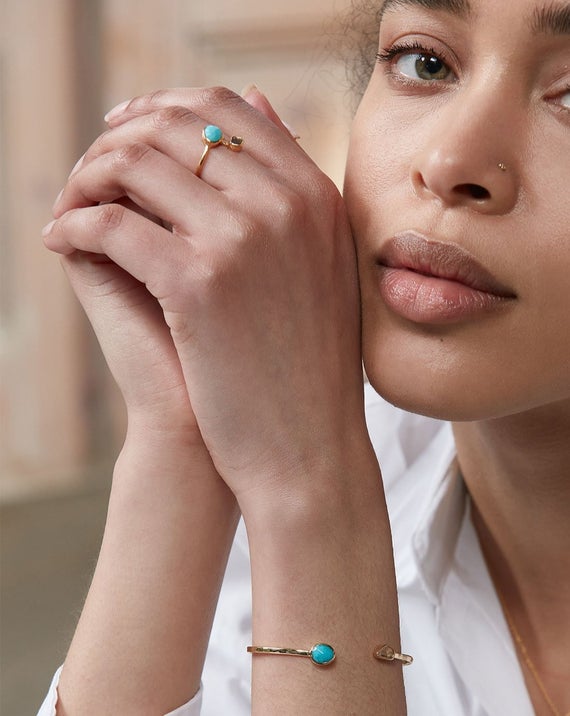 A mesmerising gemstone combination of turquoise and rough diamonds highlight this gold band ring. Quirky irregular details are set in 18ct gold plating and would make a stylish addition to your ring stack or captivating enough to wear solo.