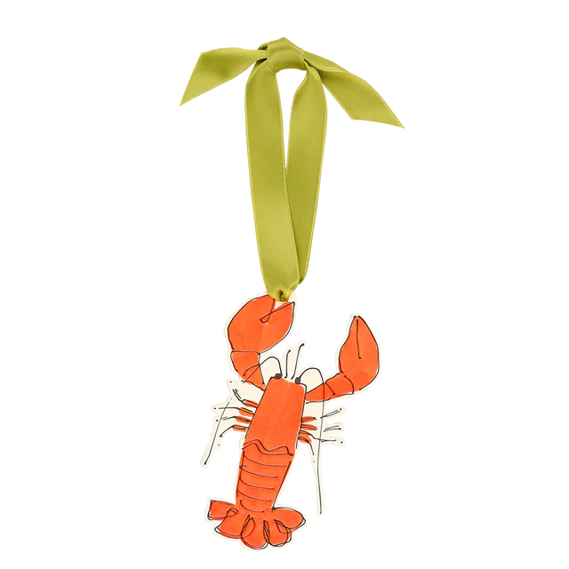 Each decoration is strung with luxurious Swiss satin chartreuse ribbon secured through a brass ring.