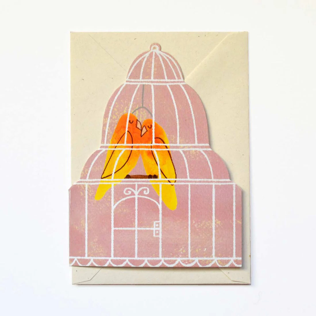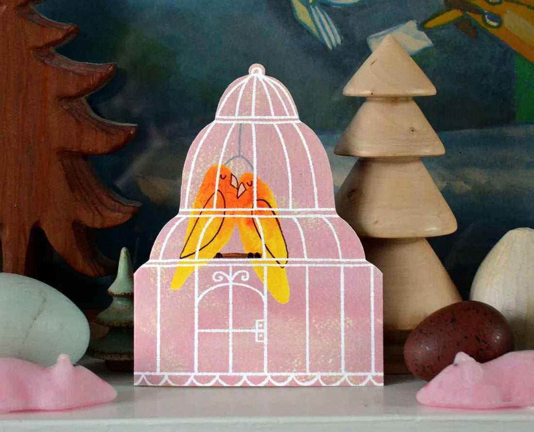 A pair of lovebirds to send to someone you love. These die cut cards are a reproduction of a painting by Alice and are printed in the UK on 100% recycled FSC approved paper. Each card comes with a recycled vegan envelope (no animal glues used) and is packaged in a fully compostable 'cello' bag made from vegetable starch.
