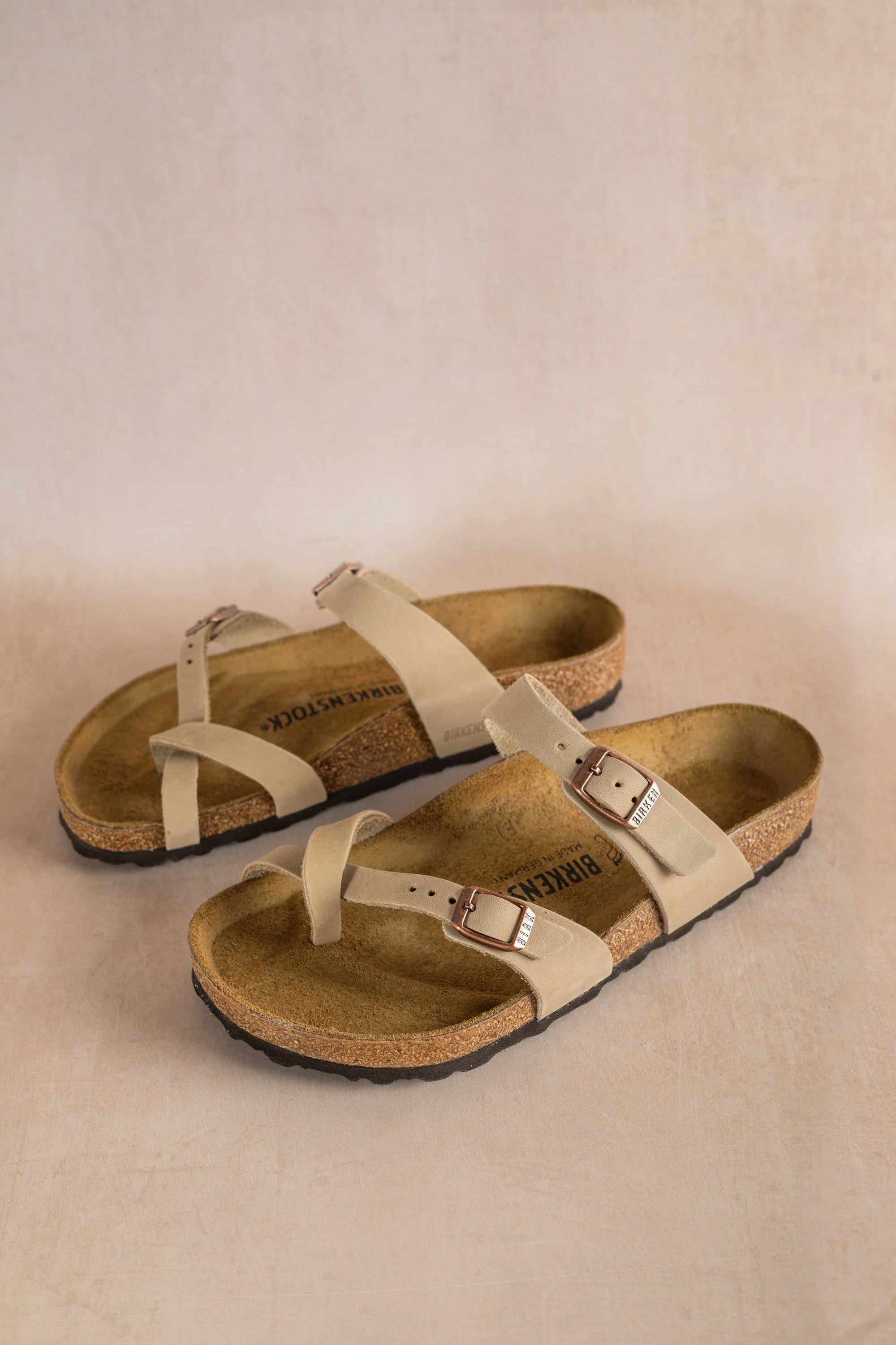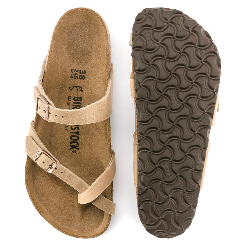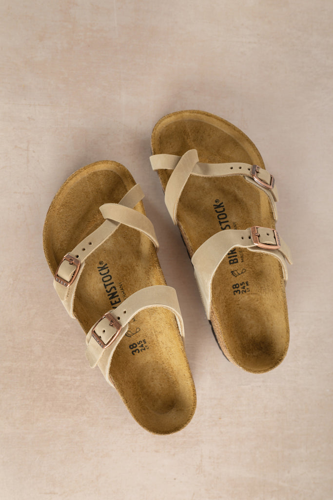 The BIRKENSTOCK Mayari thong sandal is a jaunty model with a toe loop. The impressive combination of design and wearability will see fashion-conscious men and women through the day with elegance and comfort. The upper is made from extra thick, oiled nubuck leather with an open-selvage finish.