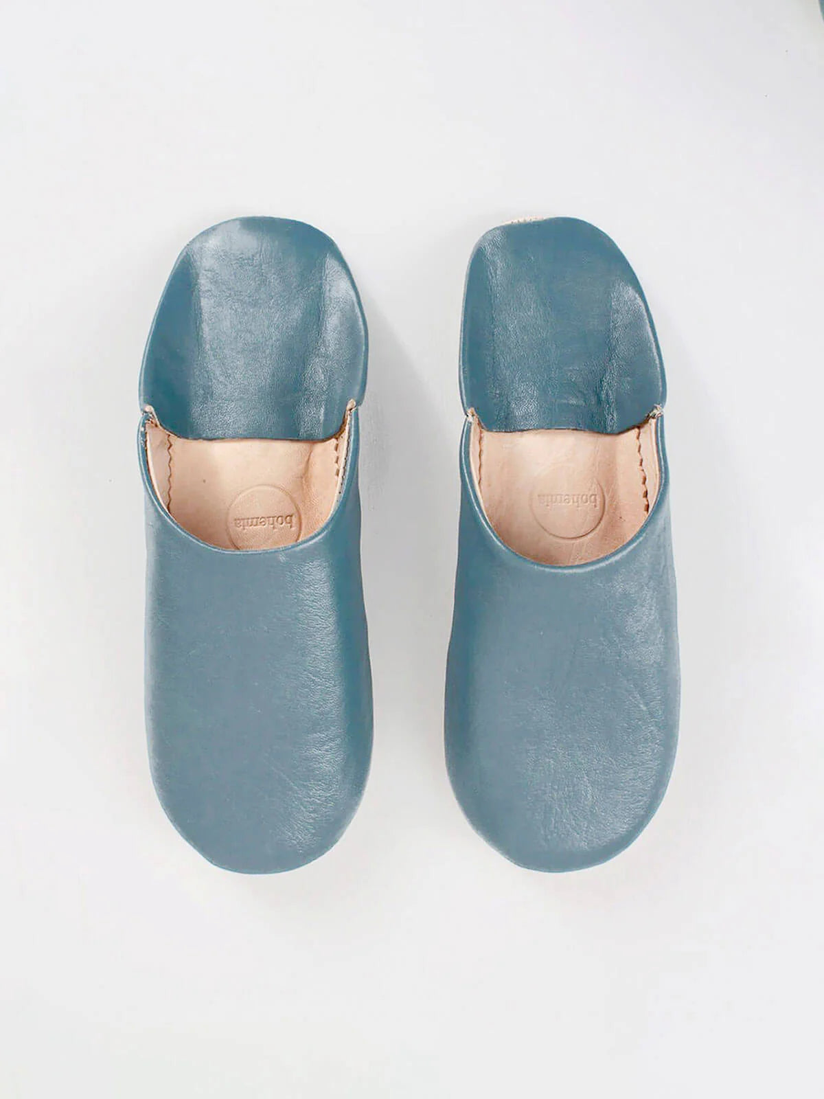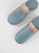 Women's Moroccan Leather Babouche Basic Slippers in Blue Grey are a traditional design, handmade by artisans in Morocco from beautifully soft leather in modern blue grey.