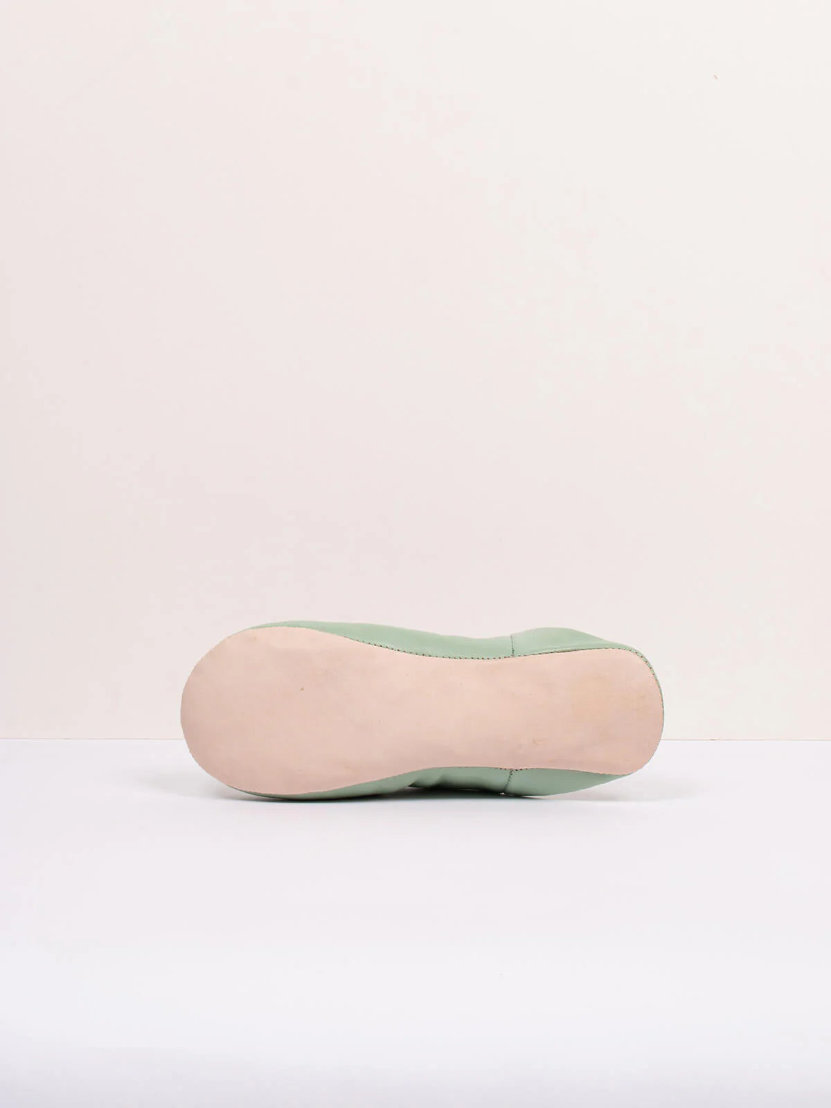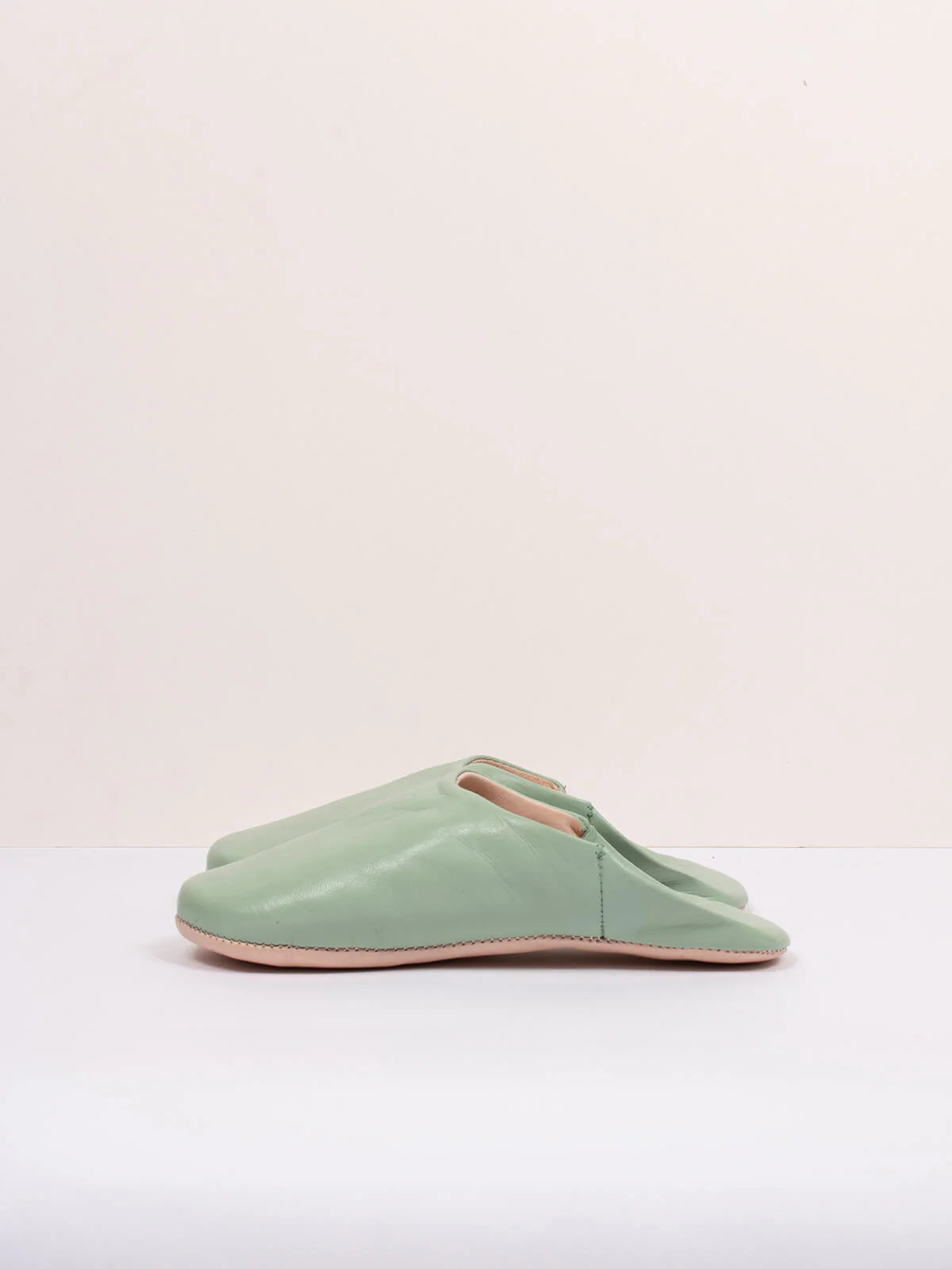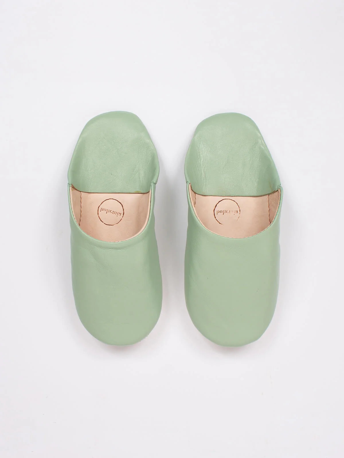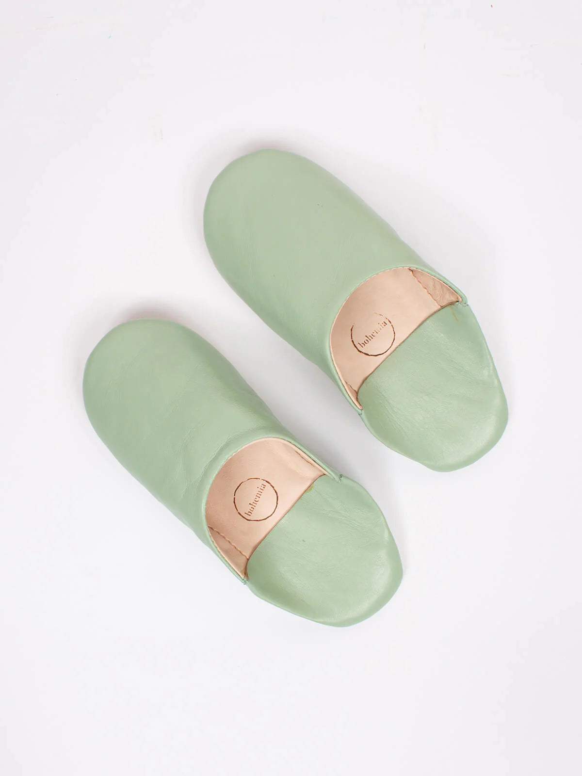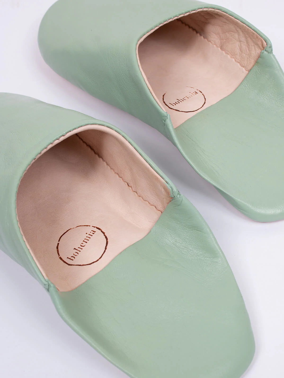 Women's Moroccan Leather Babouche Basic Slippers in Sage, are a contemporary pair of house slippers in soft sage green leather. Handmade using traditional techniques, our Bohemia babouche slippers are crafted by a team of artisans in Bohemia's workshop in the medina of Marrakech.