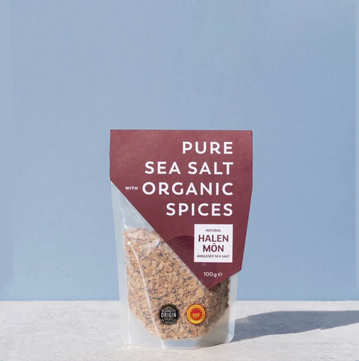 Ingredients: Halen Môn Pure Sea Salt PDO (80%), Organic Spice Mix [Cracked peppercorns, Turmeric, Coriander, Paprika, Cumin, Nutmeg, Cinnamon, Ginger, Chilli, Whole peppercorns, Cloves] (20%). Country of origin: Wales, (UK).