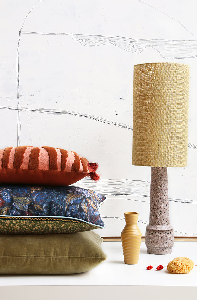 Inspired by the 60s and 70s we added some enlightenment to our line of lights! A great array of lighting to mix and match as you choose. From retro to fat lava inspired glazed table lamp bases. We designed different lamp shades to mix as you like: beautiful plain shades in jute - and silk fabric. Or all-over printed vintage inspired DORIS for HKLIVING shades. Switching on the lights was never this funky before!