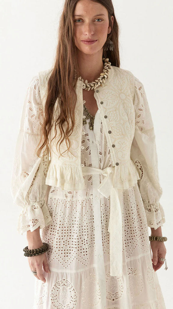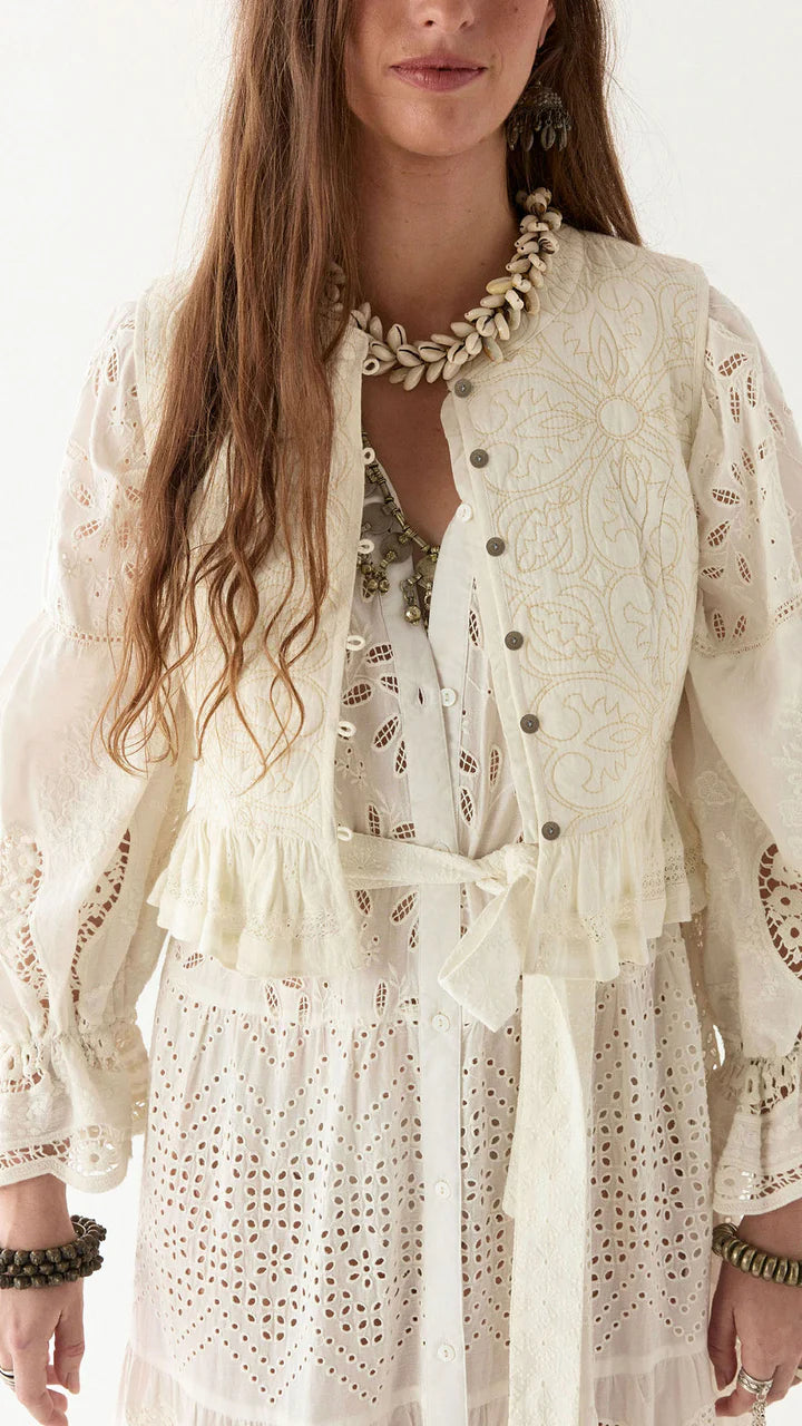 Cut from delicately quilted cotton, Sandro features intricate embroidery that echoes old-world artistry. The soft ivory hue makes it a natural layering piece, bringing subtle structure to flowing silhouettes.