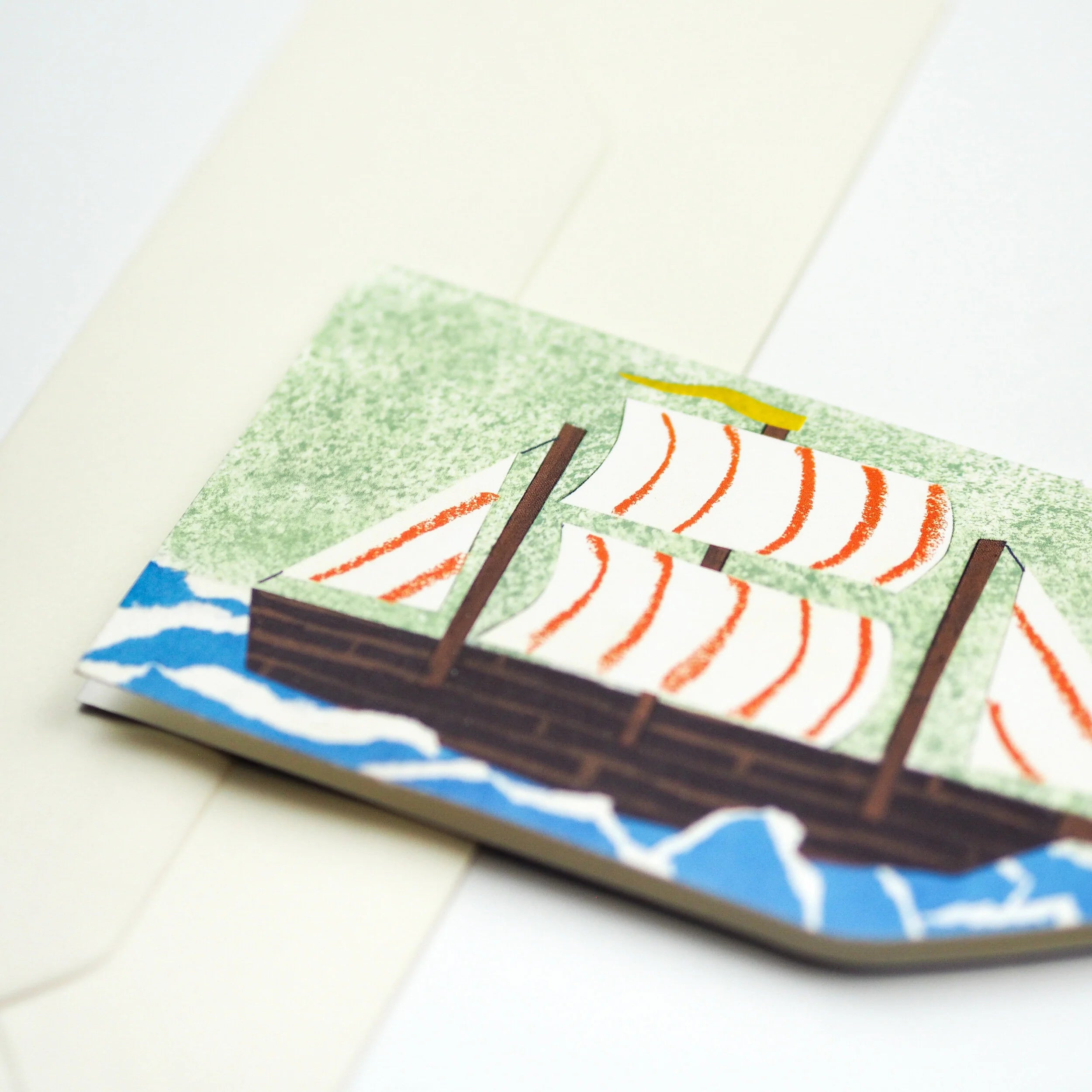 A ship in a bottle card! Good for any nautical nuts you may know or for someone taking a trip. This card is cut in to a bottle shape and has a fun, mid-century vibe.