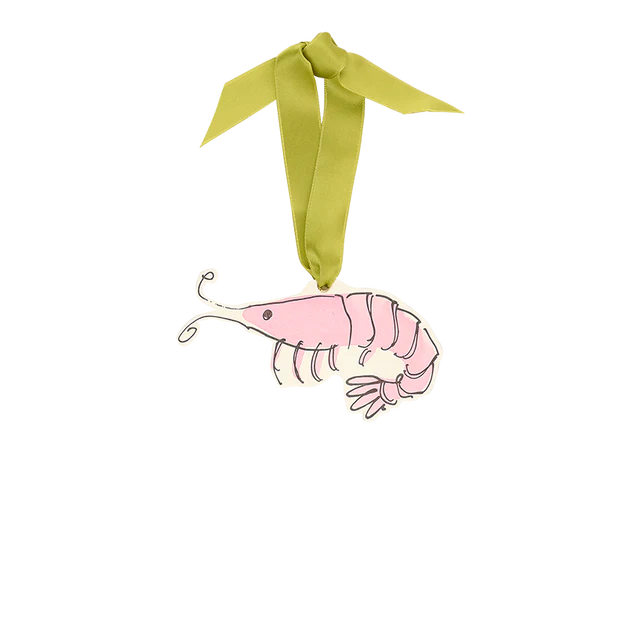 Each decoration is strung with luxurious Swiss satin chartreuse ribbon secured through a brass ring.