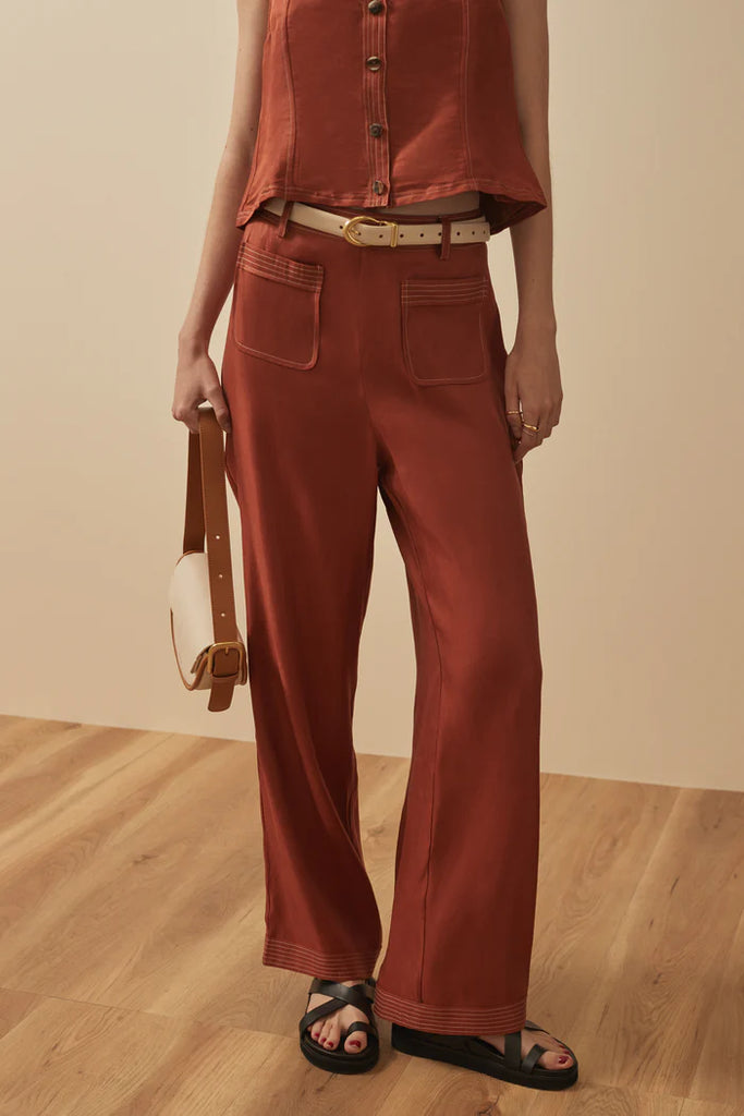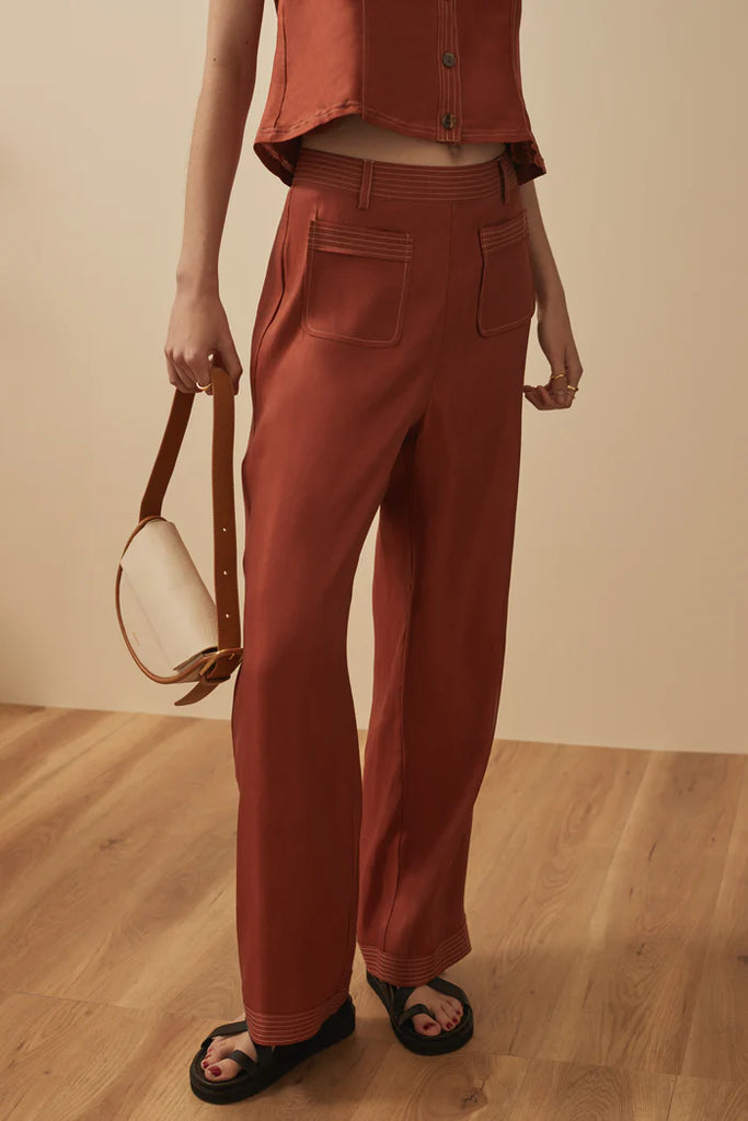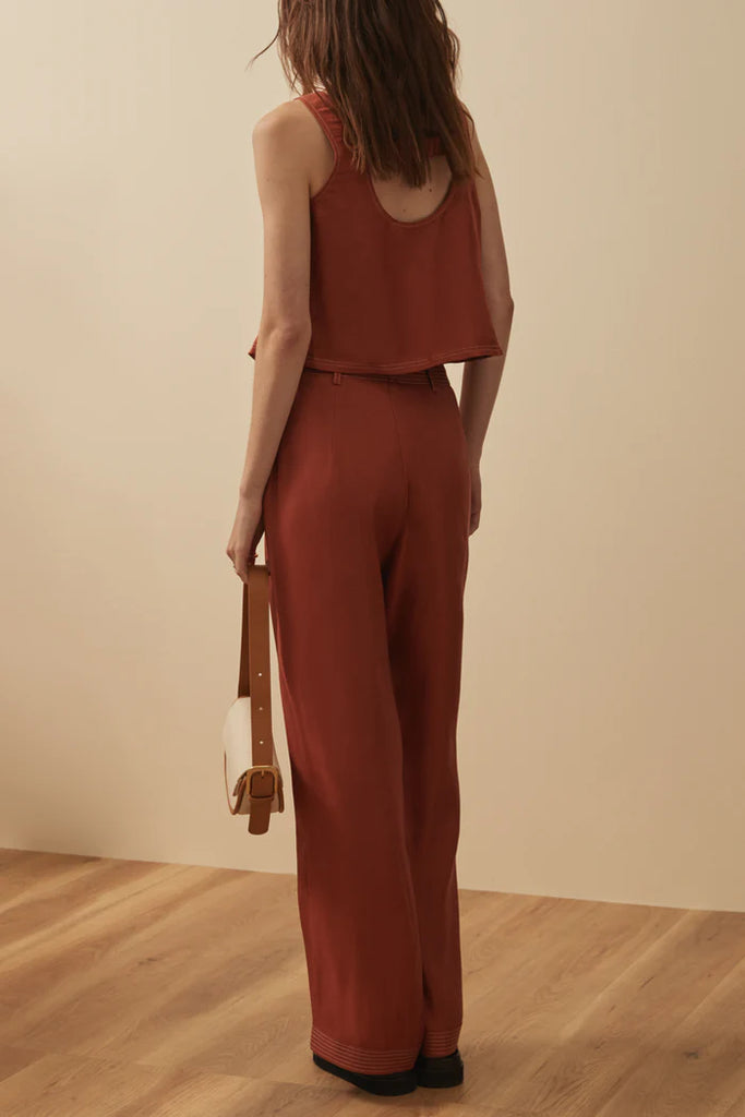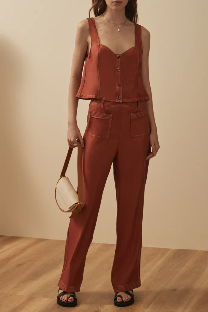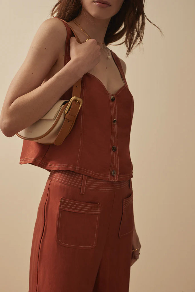 A versatile piece, the Nora Top features a timeless, button front while featuring a lovely elasticated strap detail on the back. The detailing is highlighted by a contrast stitch and the length sits perfectly at the low hip, making it a dream to pair back with the Eynid pants for the perfect set.