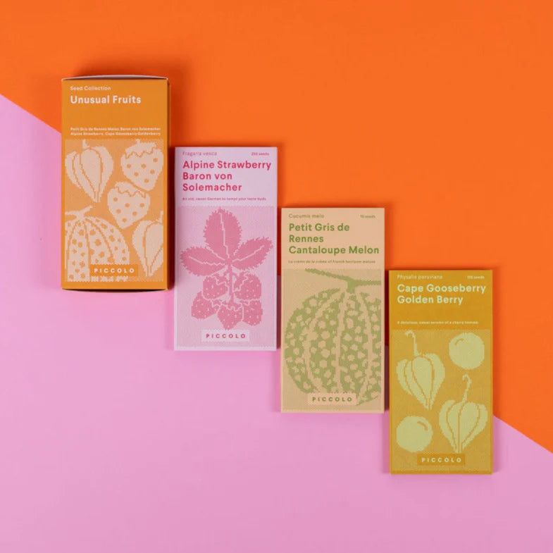 Contains 3 seed packets of: Alpine Strawberry Baron von Solemacher, Petit Gris de Rennes Cantaloupe Melon and Cape Gooseberry Golden Berry.