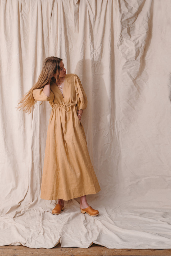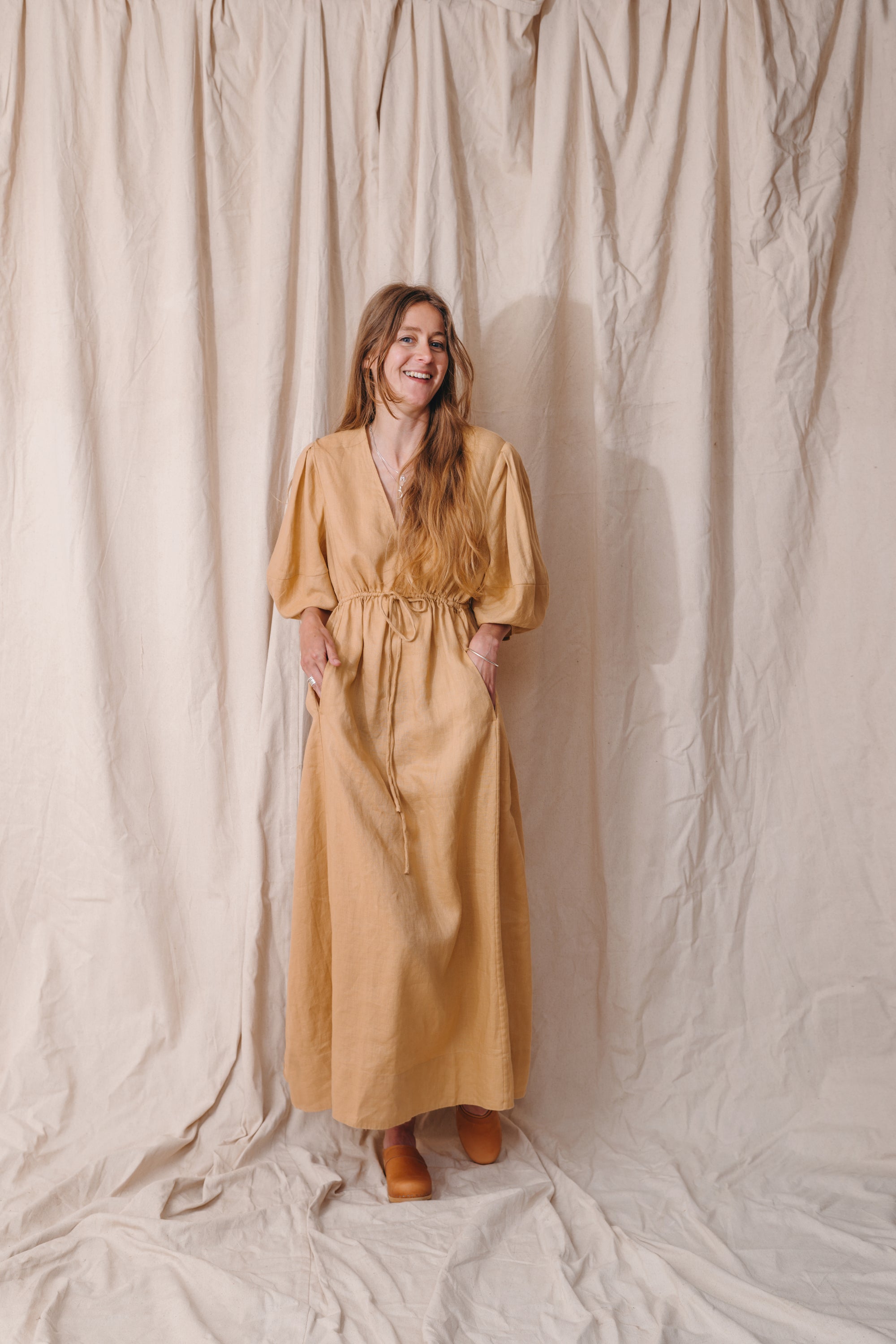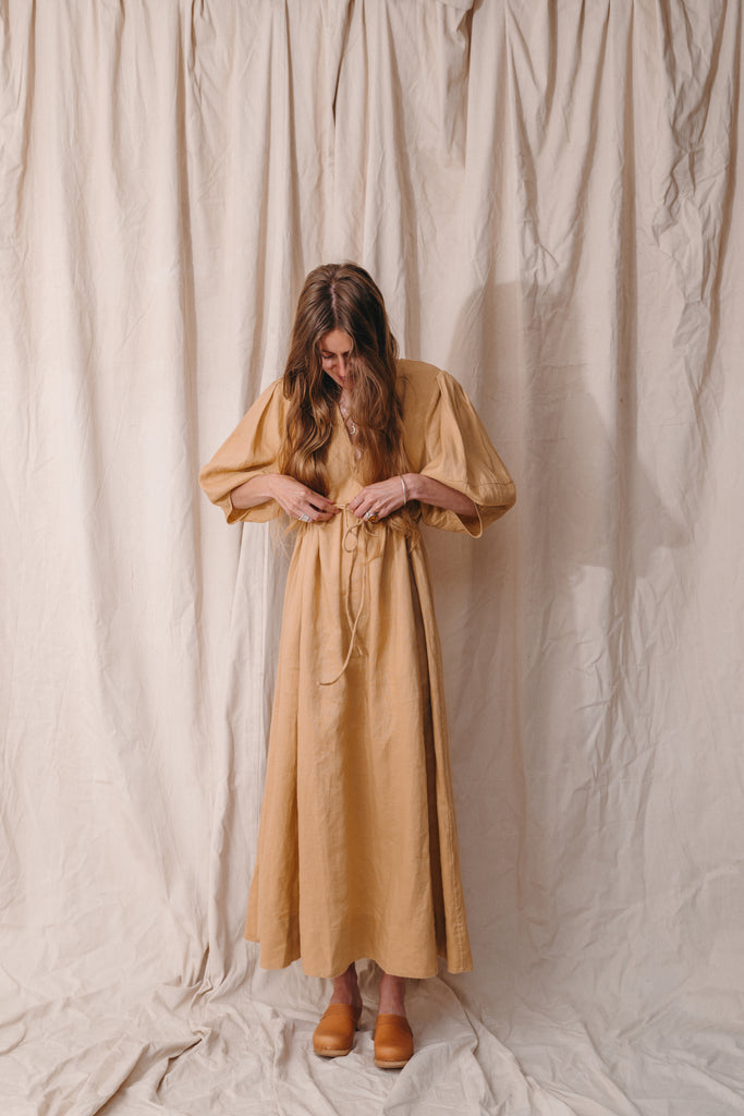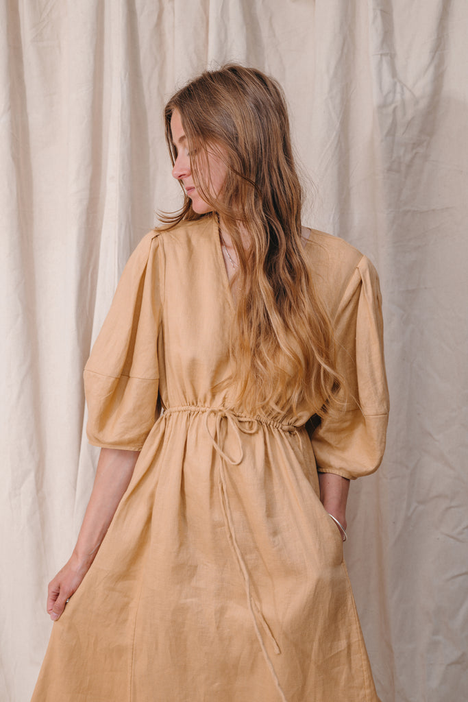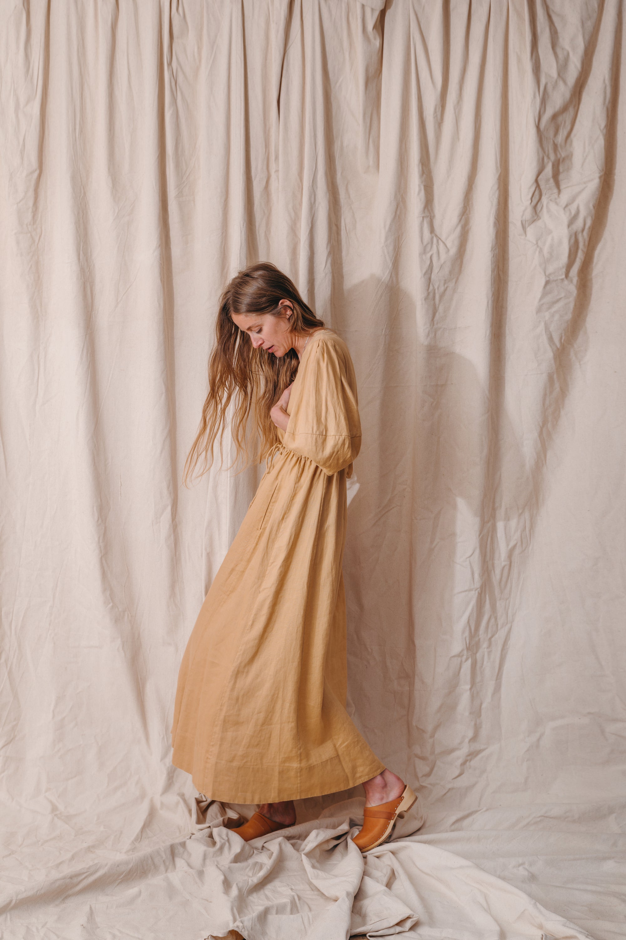 Introducing the Vida Linen Dress, crafted from 100% organic linen for a luxuriously soft and sustainable feel. With a front tie waist and oversized bell sleeves, this dress exudes effortless elegance. Plus, side pockets add convenience to style. Upgrade your wardrobe with this timeless piece.