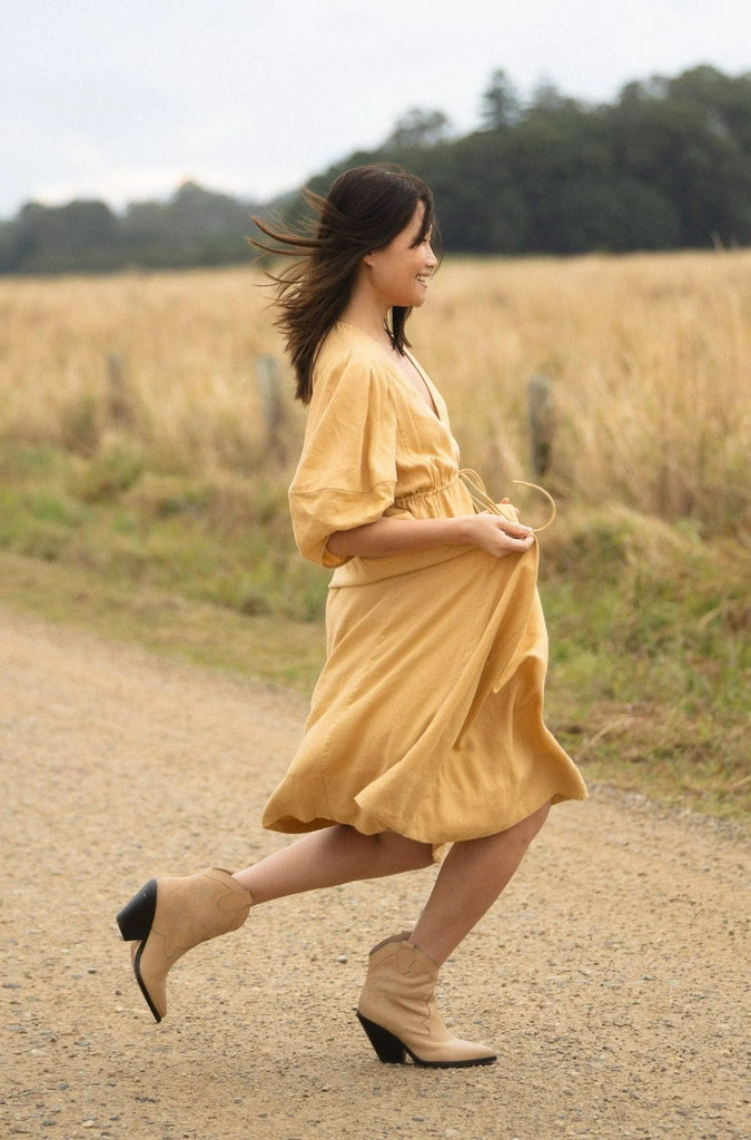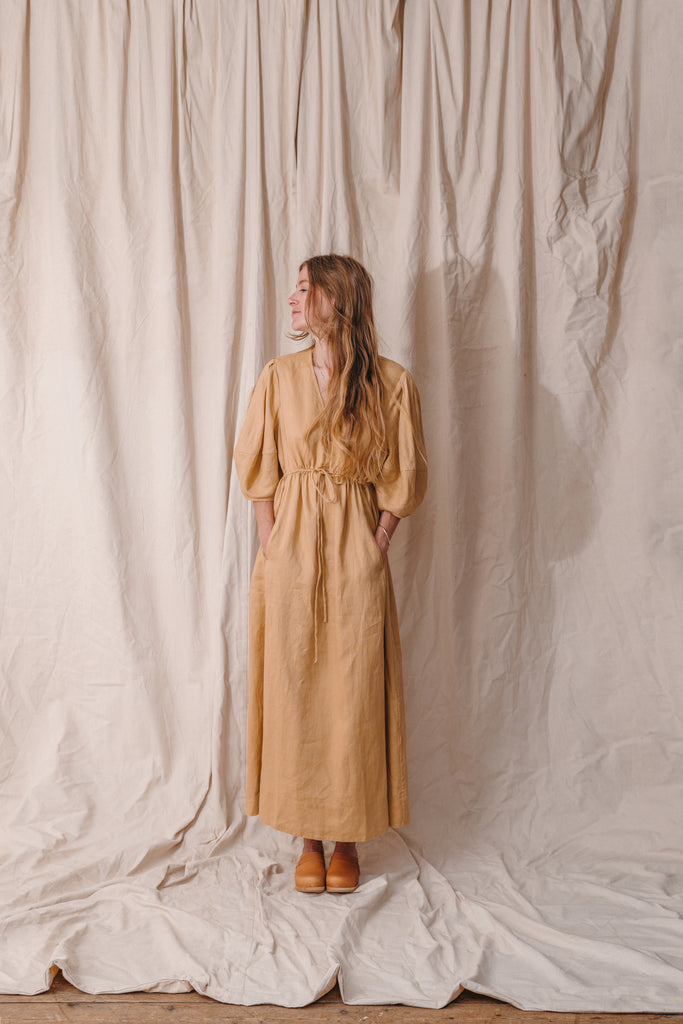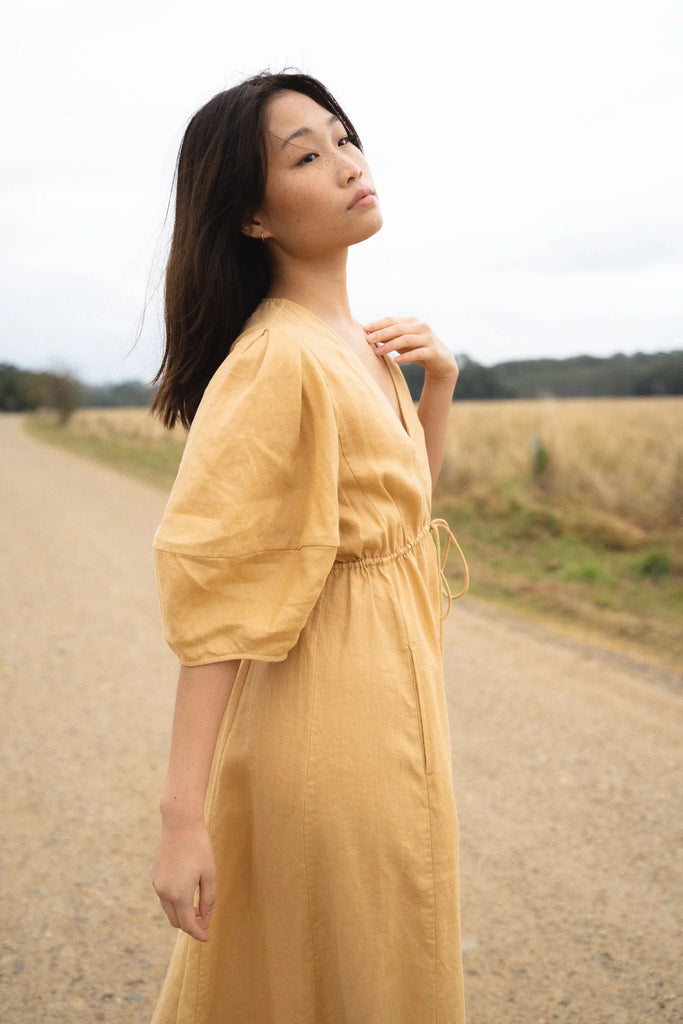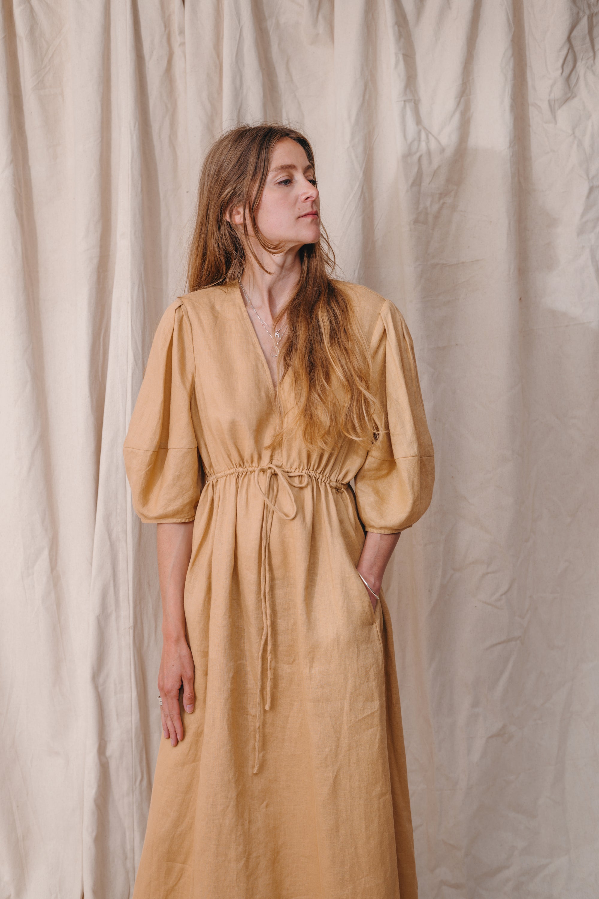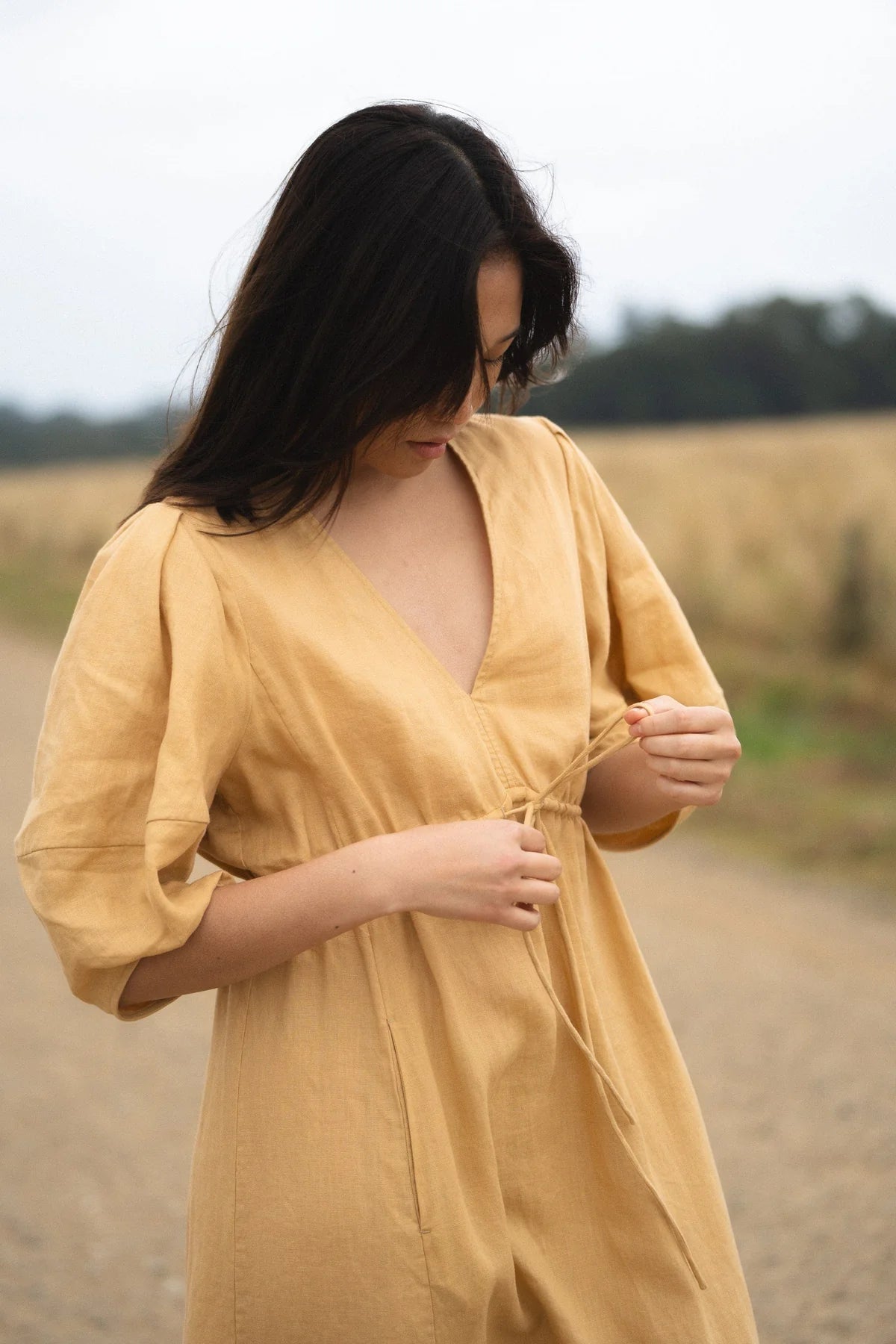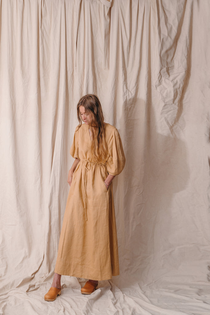 Introducing the Vida Linen Dress, crafted from 100% organic linen for a luxuriously soft and sustainable feel. With a front tie waist and oversized bell sleeves, this dress exudes effortless elegance. Plus, side pockets add convenience to style. Upgrade your wardrobe with this timeless piece.